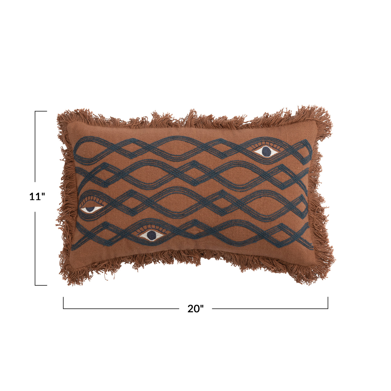 Catalog Name: 20"L x 11"H Cotton Lumbar Pillow w/ Embroidery, Eyes & Fringe, Brown & Navy Color