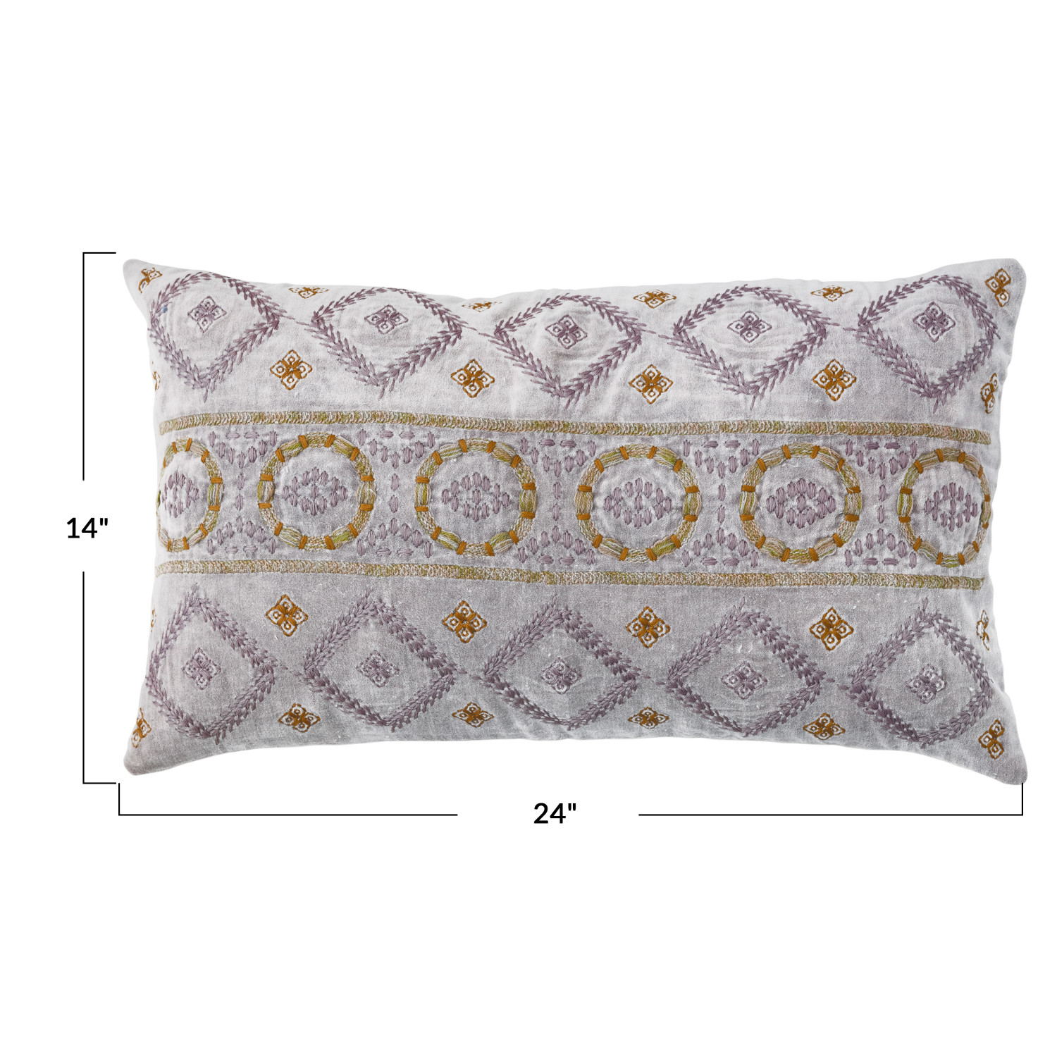 Catalog Name: 24"L x 14"H Cotton Velvet Lumbar Pillow w/ Embroidered Pattern & Chambray Back, Purple & Mustard Color