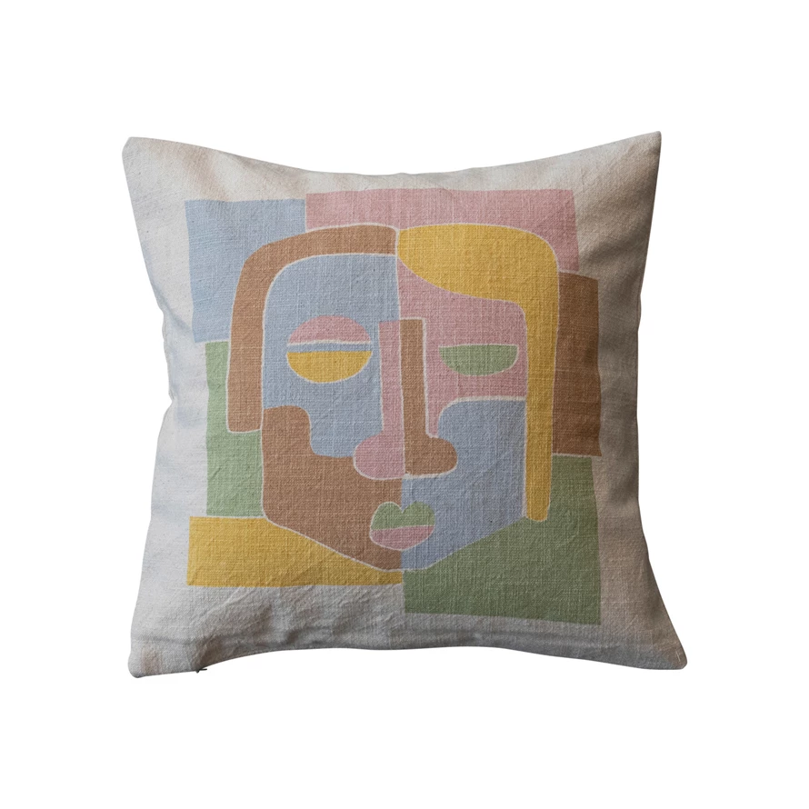 Catalog Name: 18" Square Woven Cotton Slub Printed Pillow w/ Abstract Face, Multi Color