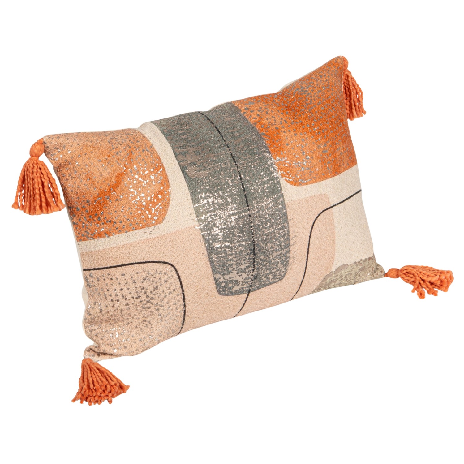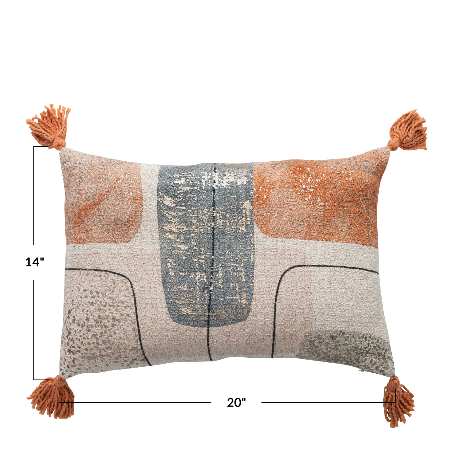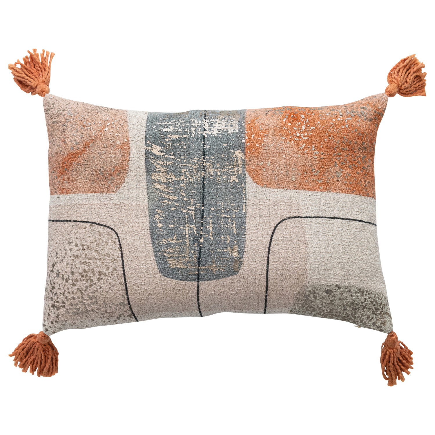 Catalog Name: 20"L x 14"H Cotton Jacquard Printed Lumbar Pillow w/ Abstract Design, Gold Foil & Tassels, Multi Color