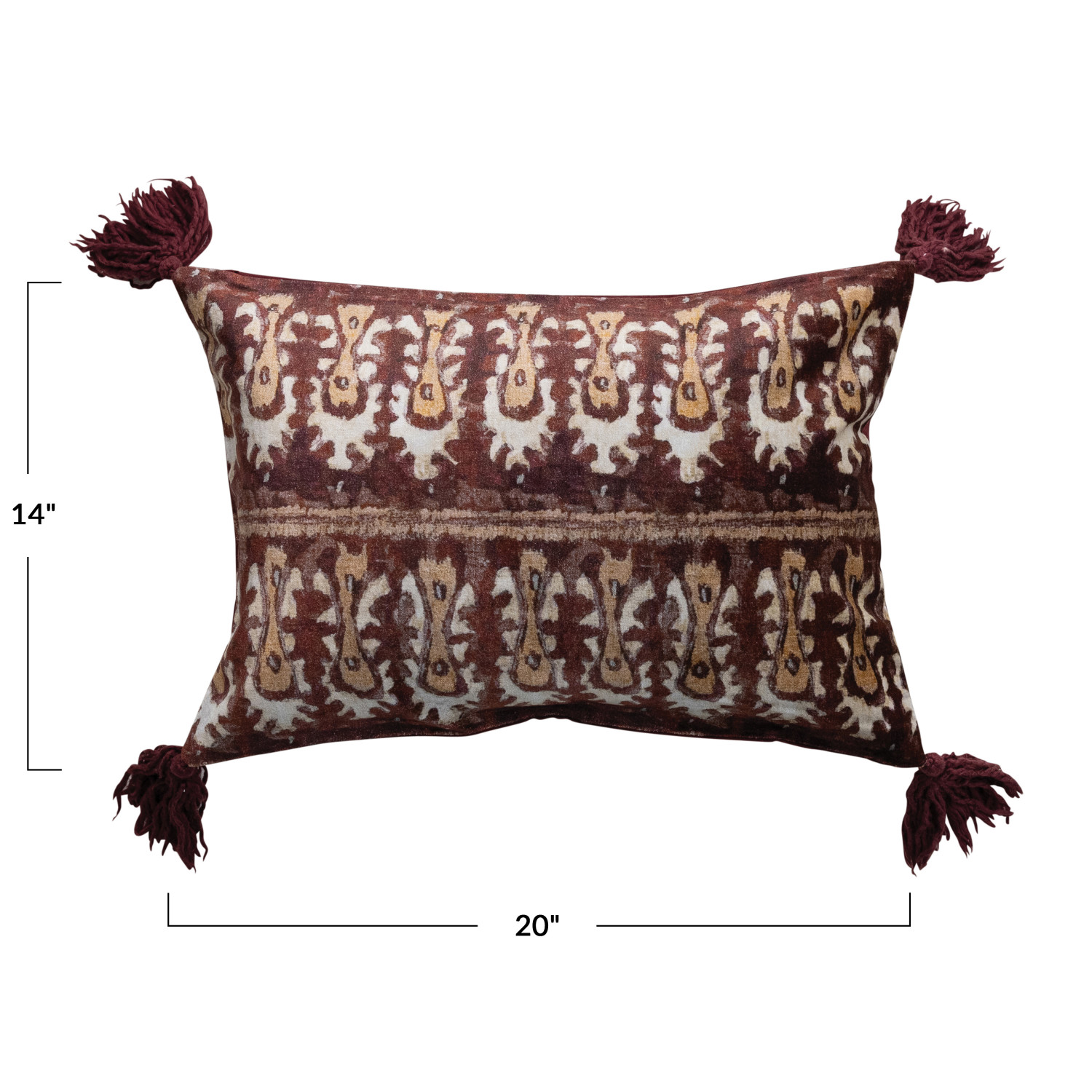 Catalog Name: 20"L x 14"H Cotton Velvet Ikat Printed Lumbar Pillow w/ Tassels, Multi Color