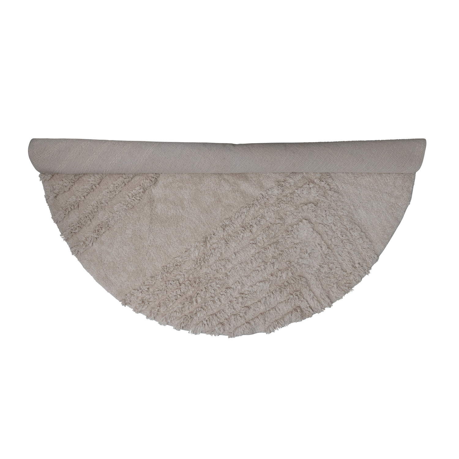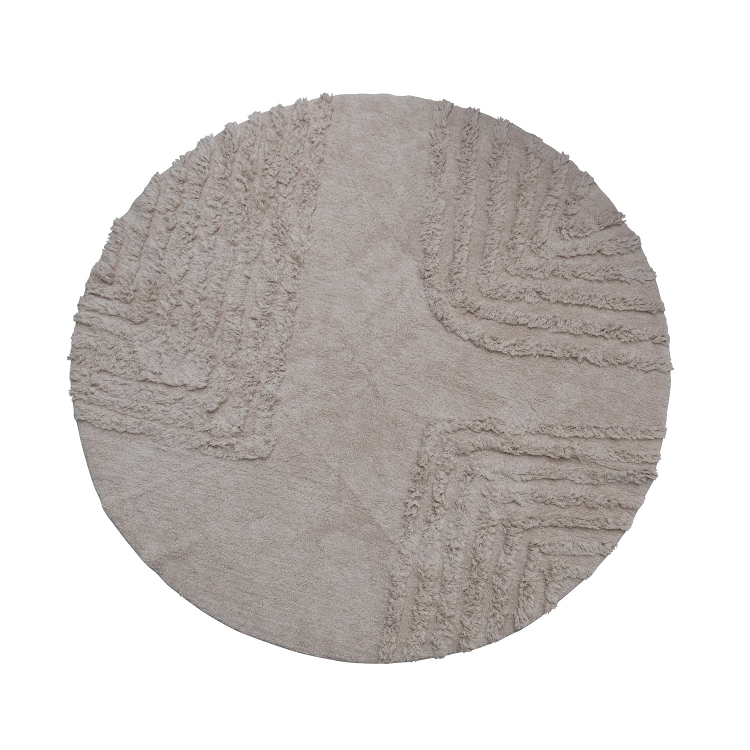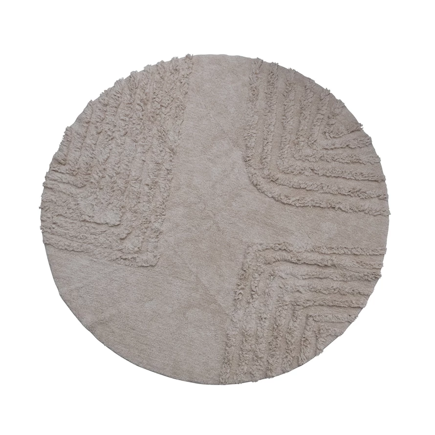 This contemporary round rug showcases supple cotton with a tufted, geometric design.