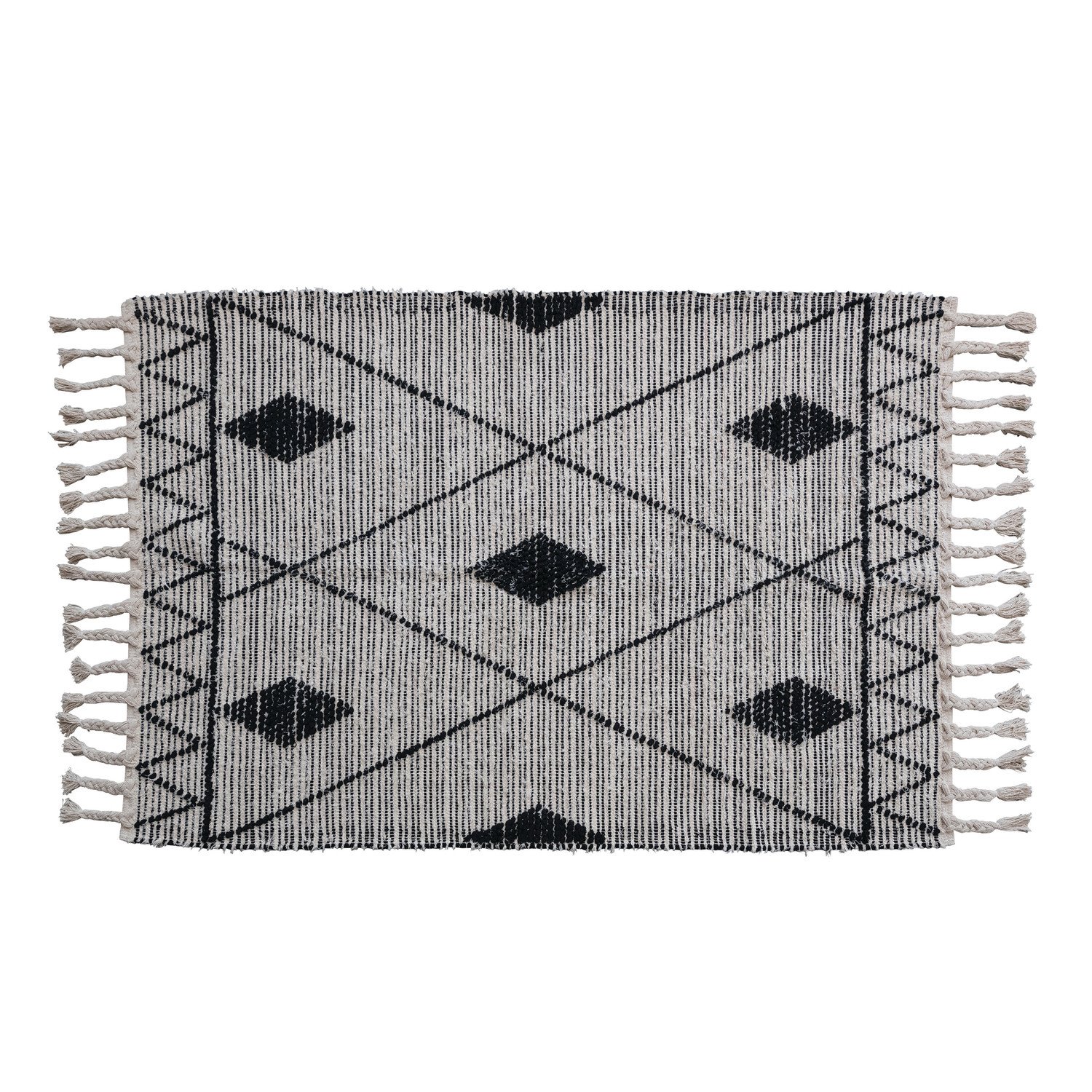 Catalog Name: 4' x 6' Hand-Woven Cotton Rug w/ Geometric Pattern & Braided Fringe, Black & Natural