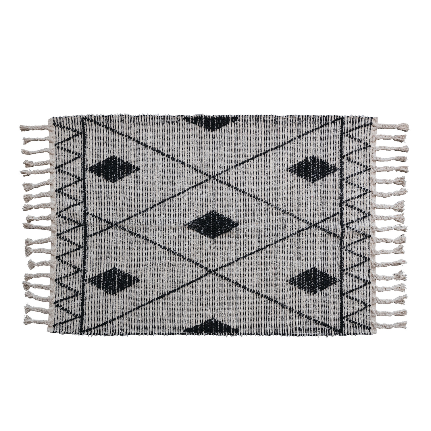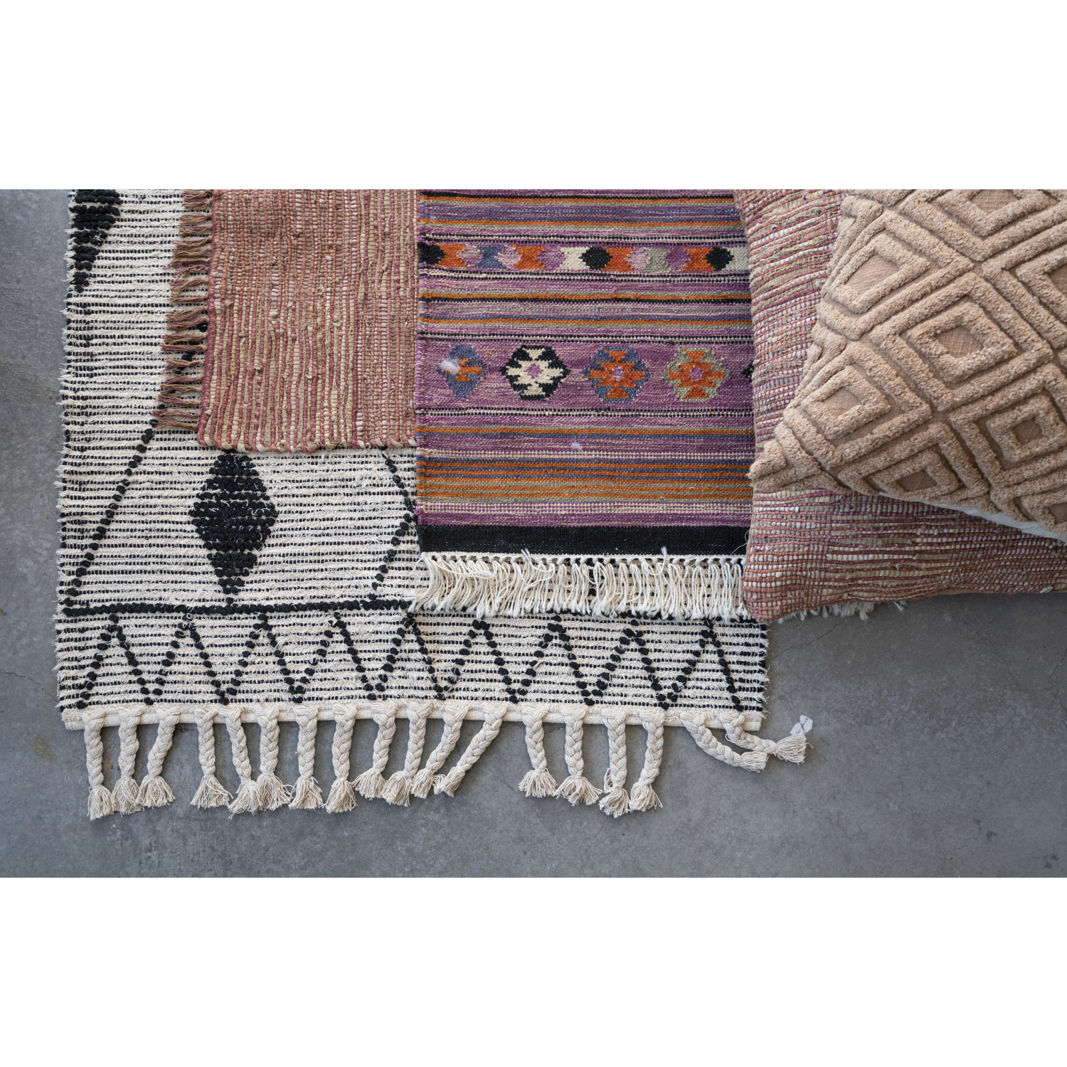 Catalog Name: 4' x 6' Hand-Woven Cotton Rug w/ Geometric Pattern & Braided Fringe, Black & Natural