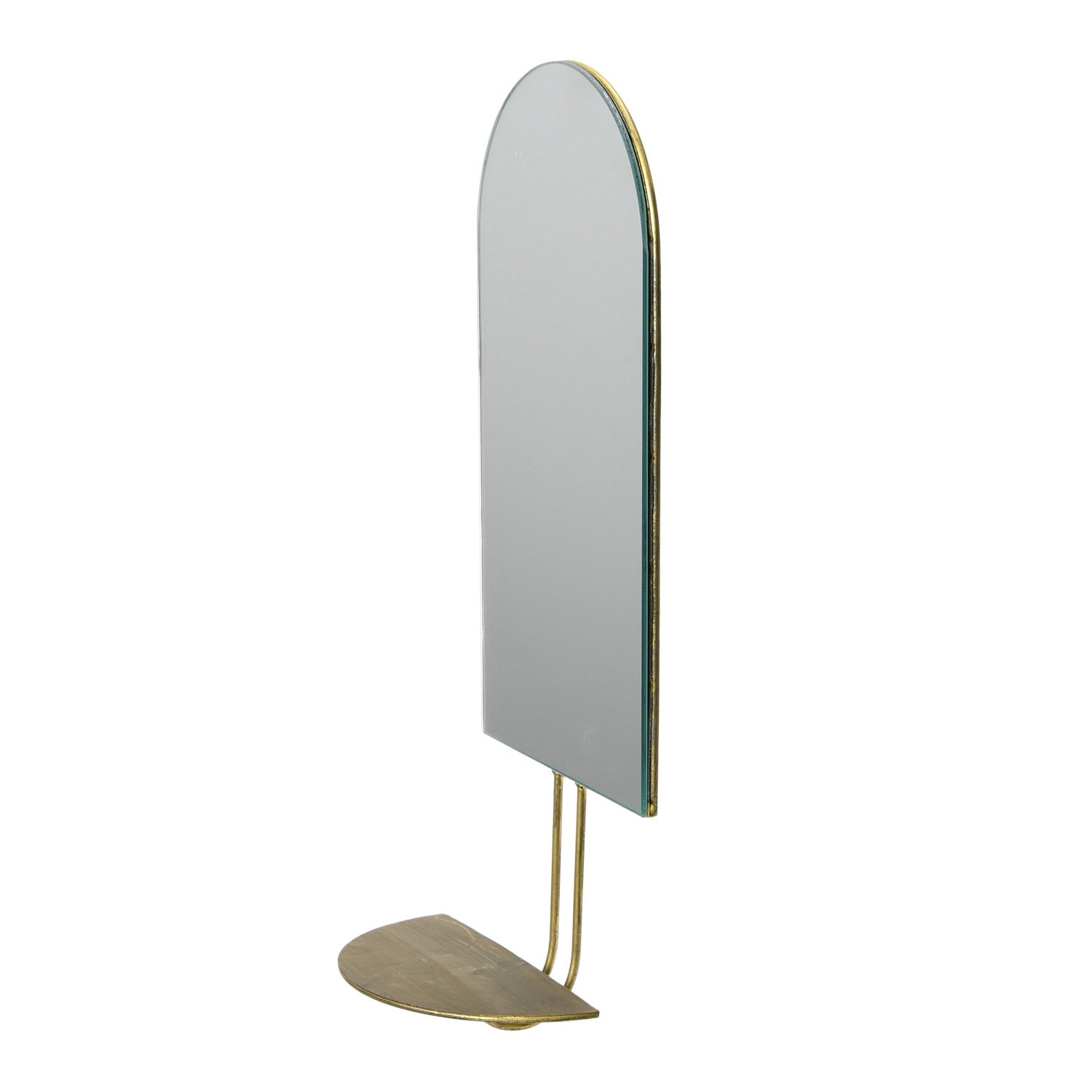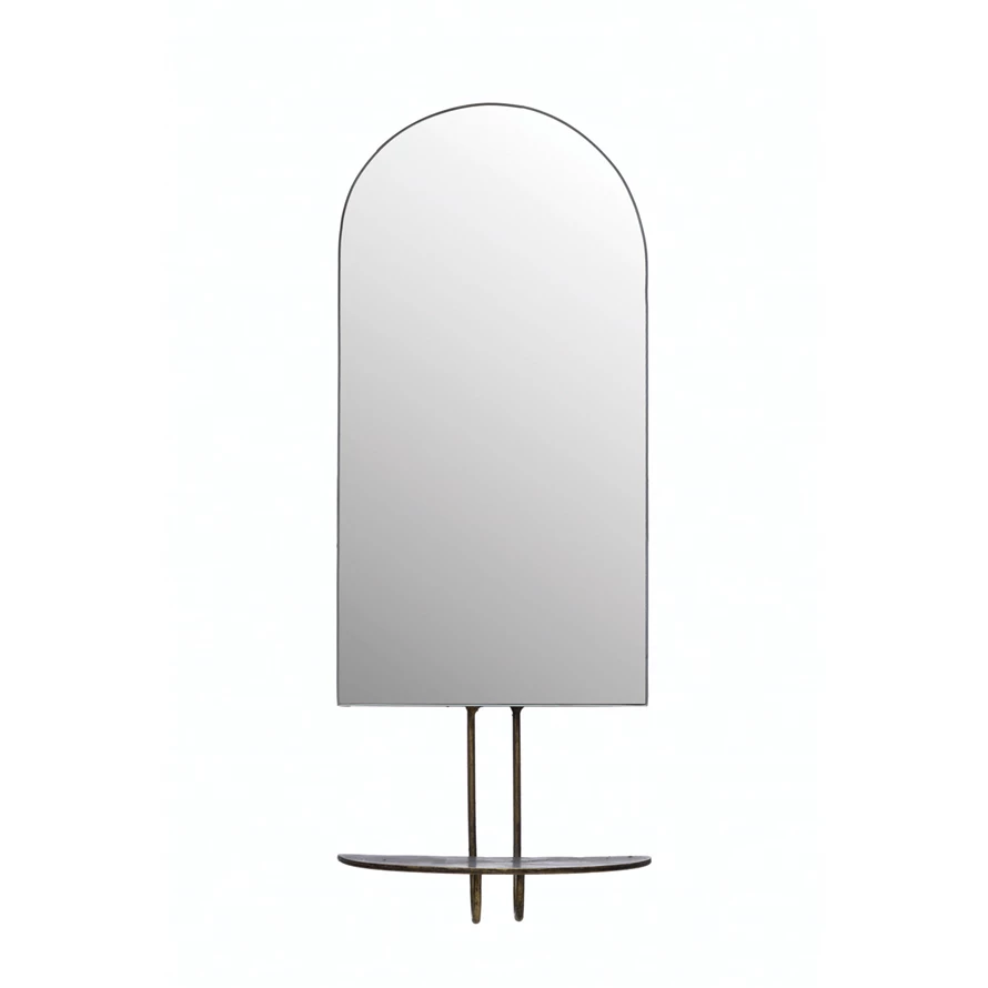 This strikingly modern wall mirror features an arched silhouette encased in a sleek metal frame with an attached shelf. Arched wall mirror with antique gold metal frame and attached shelf. Add style and depth to any living space with this artfully crafted mirror. Made from glass and iron.