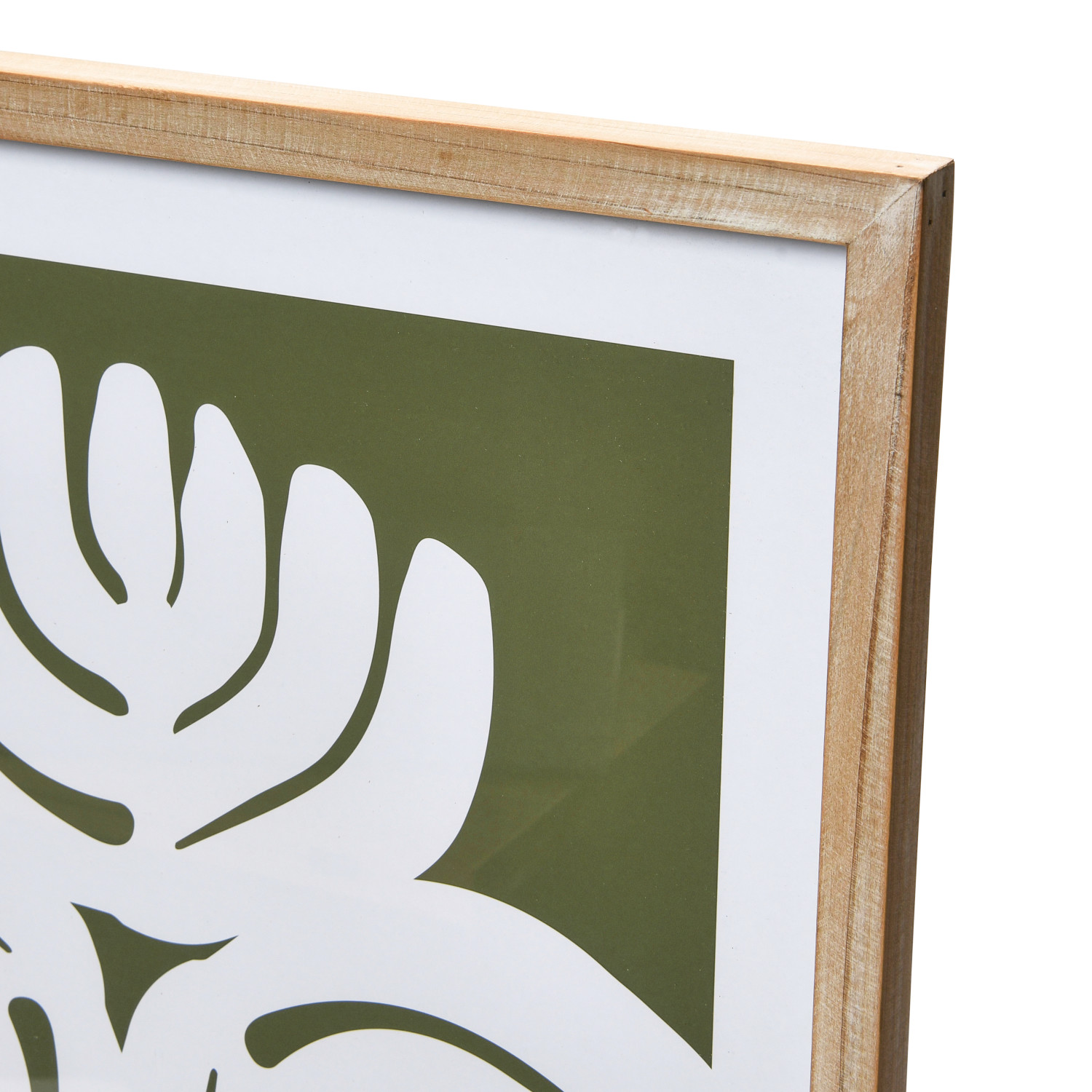 This nature inspired wall art showcases an abstract monstera print encased in a white wood frame.