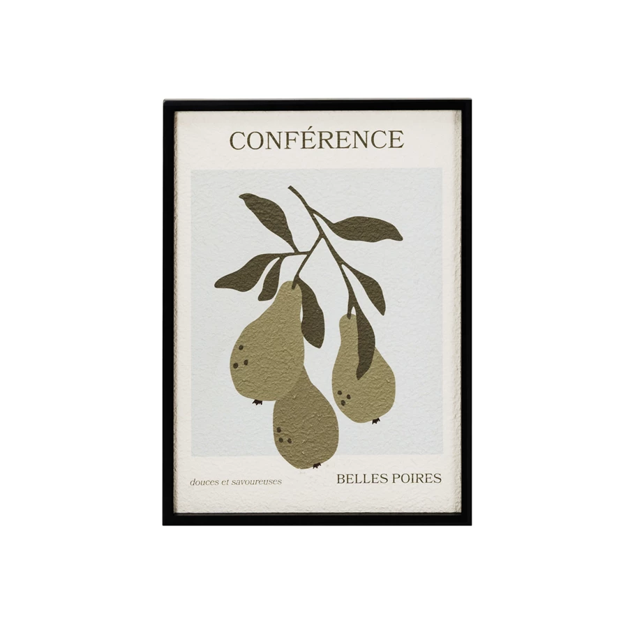 This wood-framed textured paper wall decor features a vintage print of pears in various colors and sizes, with the word "Conference" in a script font at the top. The print has a vintage and artistic look, and is framed by wood and glass for a natural and quality feel. The decor can be hung vertically, creating a cozy atmosphere in any room, from the kitchen to the dining room. Hang this wall decor on the wall with the hanging mechanism on the back, and it hangs vertically only. It's ideal for Scandinavian, boho, global, modern, or French country styles, adding fruitfulness and charm to any space. This wall decor makes a great gift for art and food lovers.