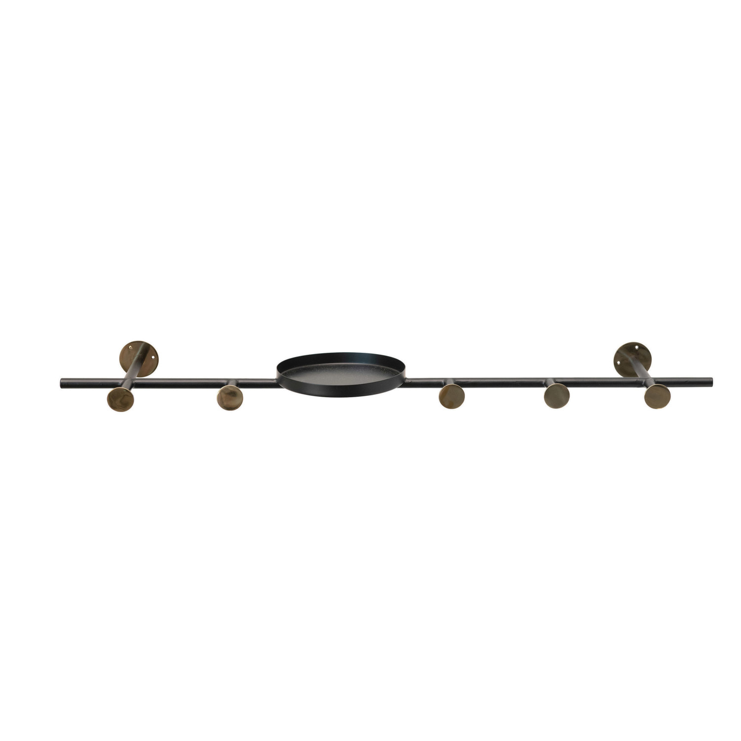 This artfully designed metal wall hook with matte black and brass finishes and one round shelf features five handy hooks. It will be a sleek and smart accent for a living room, den, office, or bedroom that works effortlessly with a wide range of styles. Additionally useful and attractive with scarves or jewelry displayed on the hooks.