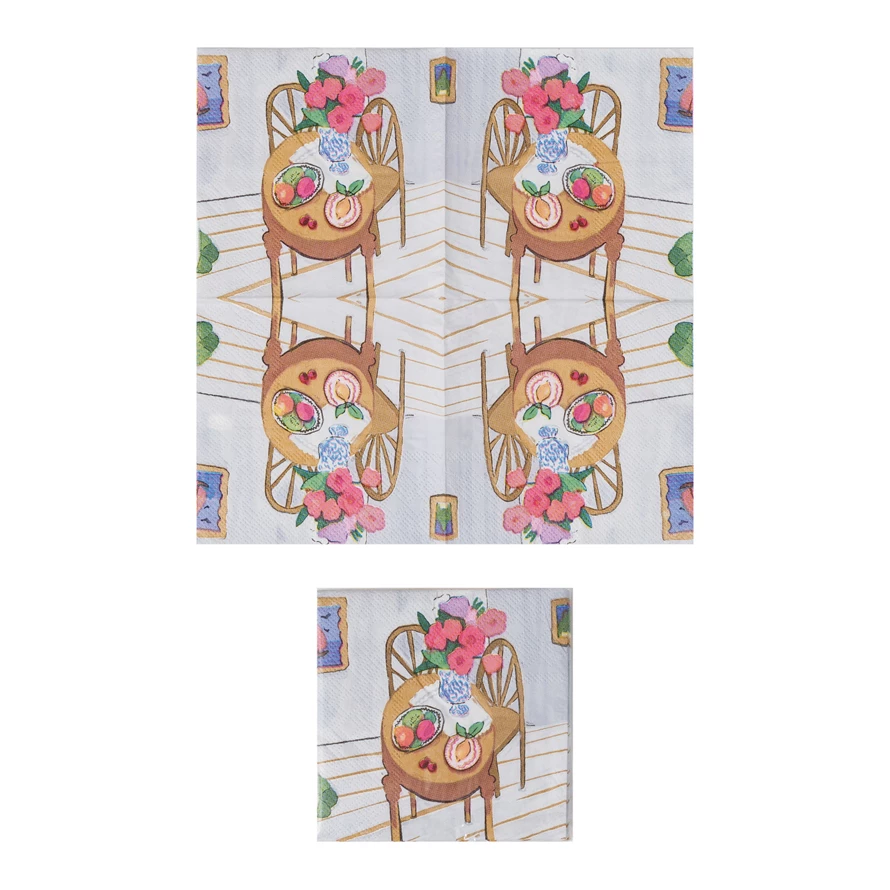 This set of 50 paper cocktail napkins with a chair/table design is a charming and eco-friendly addition to any table setting. The napkins are made of disposable, biodegradable paper, making them easy to clean and use. The chair/table design features multiple colors and flowers, creating a rustic effect. The wooden chair and table are decorated with colorful flowers and a checkered tablecloth, providing variety. This napkin can be used for serving cocktails, drinks, appetizers, or as a decorative item, matching various decor styles like farmhouse, French country, cottagecore, garden, or boho. It measures 4 inches in length and width. This is a beautiful and fun piece that will add some beauty and freshness to the table setting.