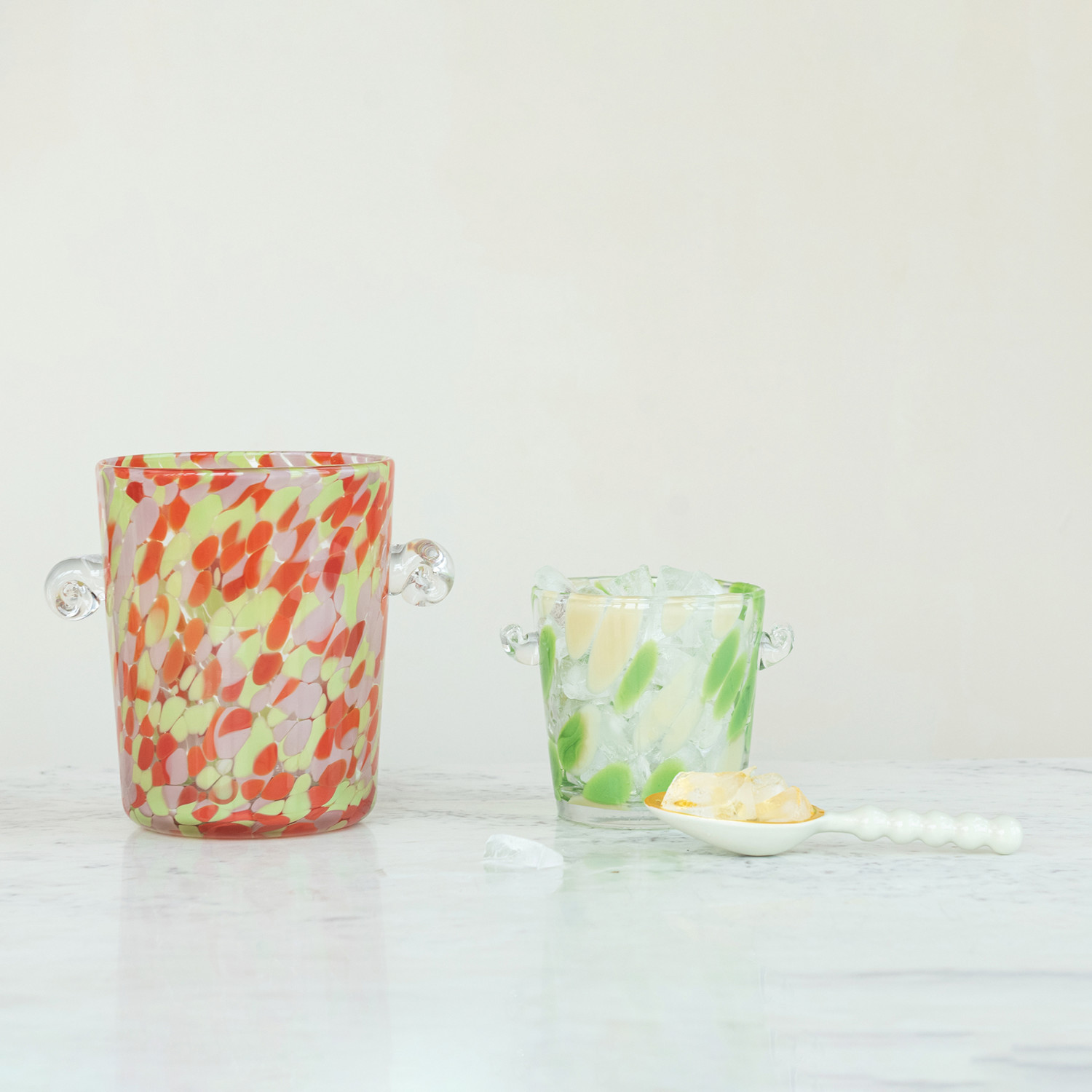 Catalog Name: 6"L x 5-1/4"W x 5-1/4"H 1 Quart Confetti Glass Ice Bucket w/ Handles, Yellow & Green
