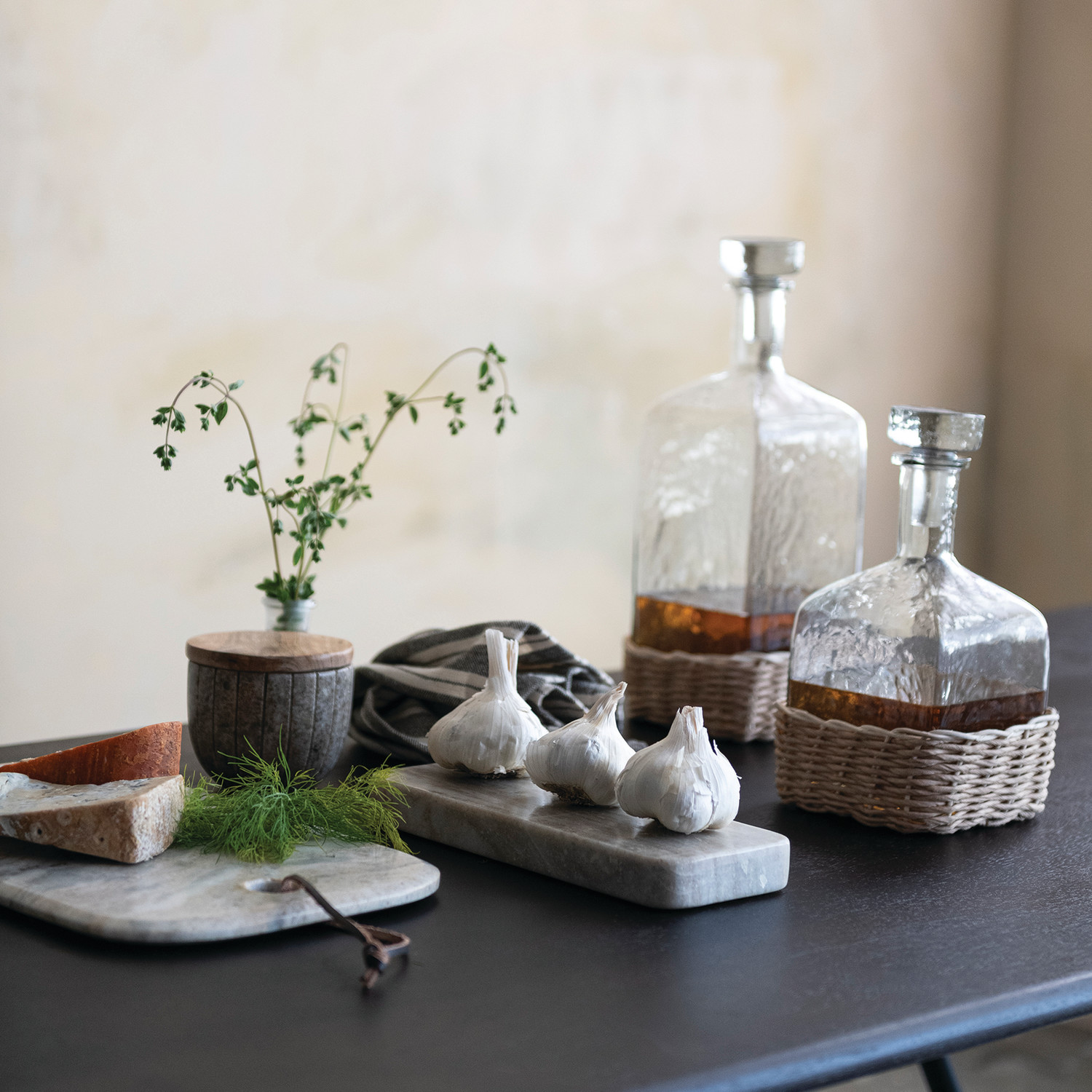 Catalog Name: 5-1/4" Square x 9-1/2"H 1-1/4 Quart Hammered Glass Bottle w/ Glass Stopper & Hand-Woven Rattan Base, Natural
