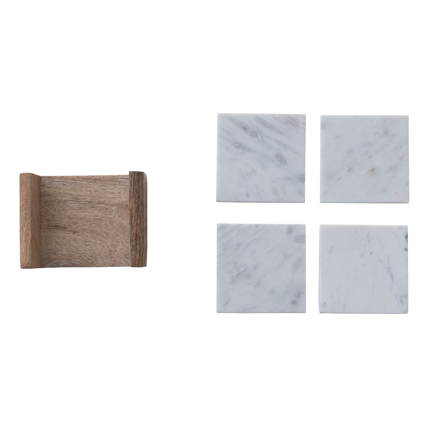 Catalog Name: 4" Square Marble Coasters w/ Mango Wood Holder, White & Natural, Set of 5