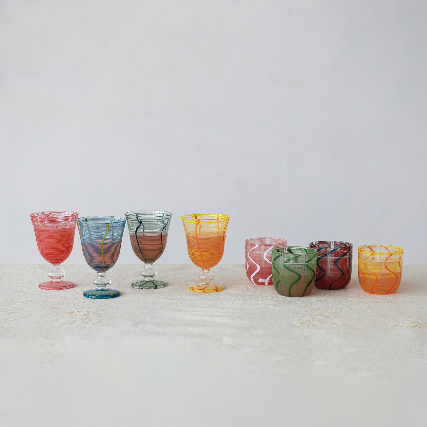 Catalog Name: 3-1/2" Round x 5-1/4"H 8 oz. Stemmed Wine Glass w/ Stripes & Wave Design, 4 Colors (Each One Will Vary)