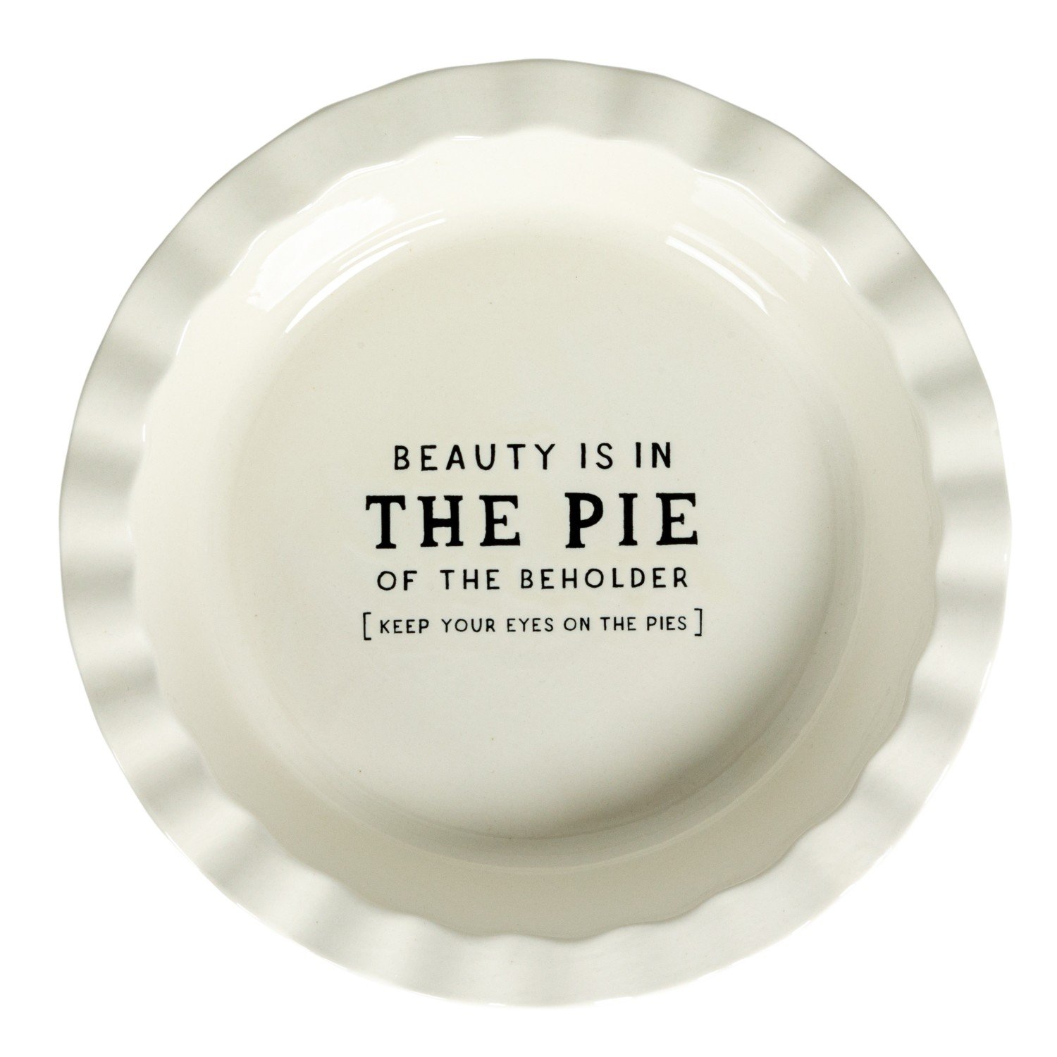 This 11.25-inch Round Stoneware Pie Dish, standing 2 inches tall, is a celebration of both form and function. Its crisp white surface is emblazoned with the playful saying "Beauty Is In.. THE PIE," making it a conversation starter at any gathering. The dish's round shape and depth are perfect for crafting everything from deep-dish apple pies to delicate quiches. Whether the decor is eclectic, farmhouse, or French country, this pie dish will fit right in, adding a dash of humor and a lot of style to any kitchen repertoire. Bring a touch of whimsy and elegance to the next baking endeavor with this charming and versatile piece.