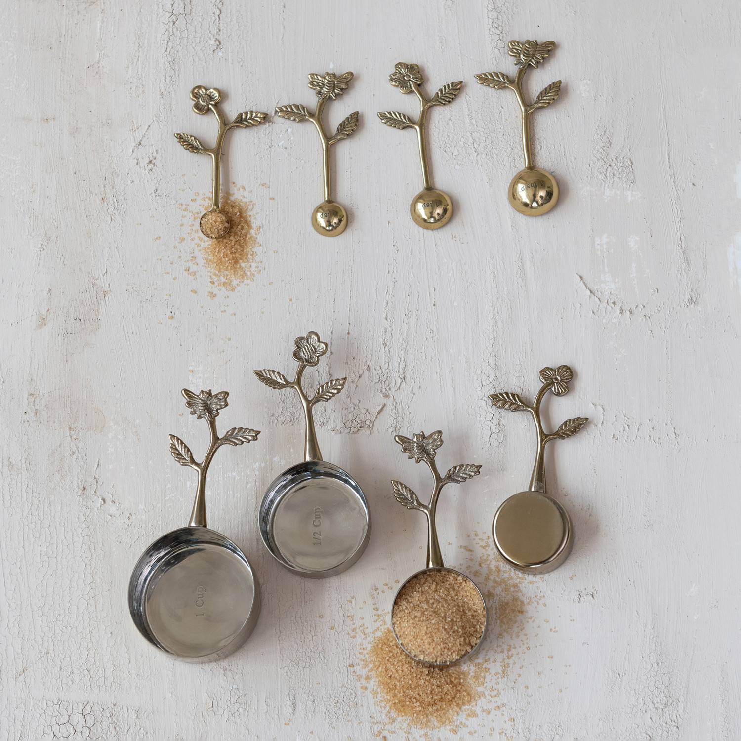 Catalog Name: 1, 1/2, 1/3 & 1/4 Cup Stainless Steel & Cast Aluminum Measuring Cups w/ Leaf & Flower Handles, Gold Finish, Set of 4
