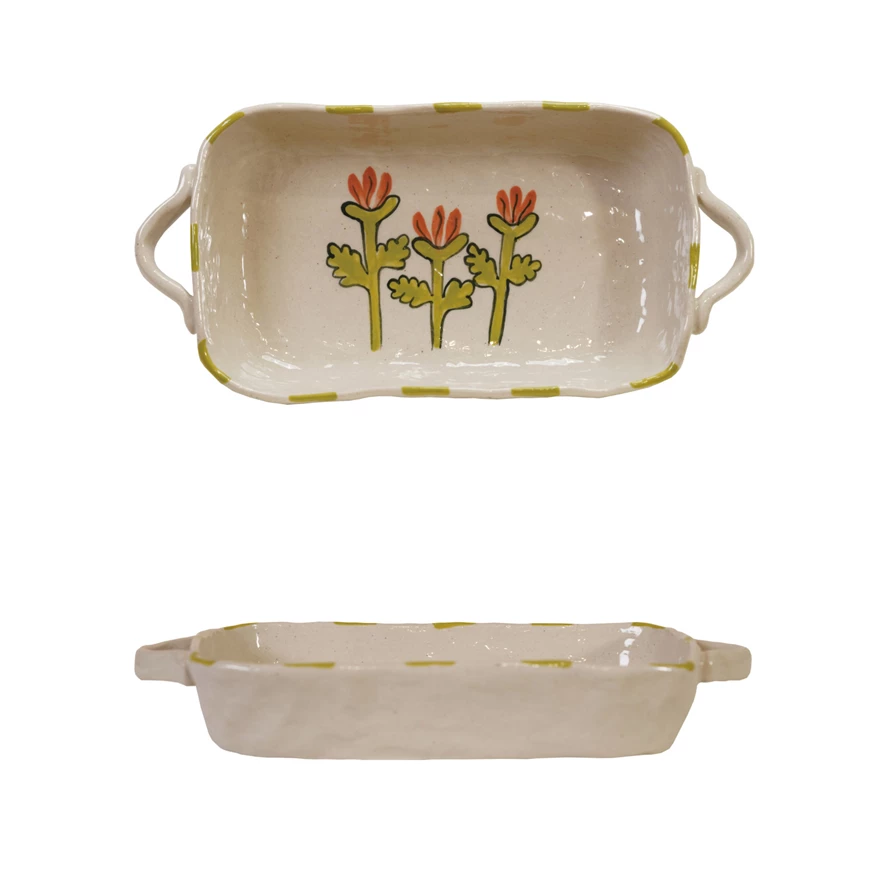 Catalog Name: 10"L x 5"W x 1-3/4"H 12 oz. Hand-Painted Stoneware Organic Shaped Baker w/ Flower Image & Handles, Multi Color