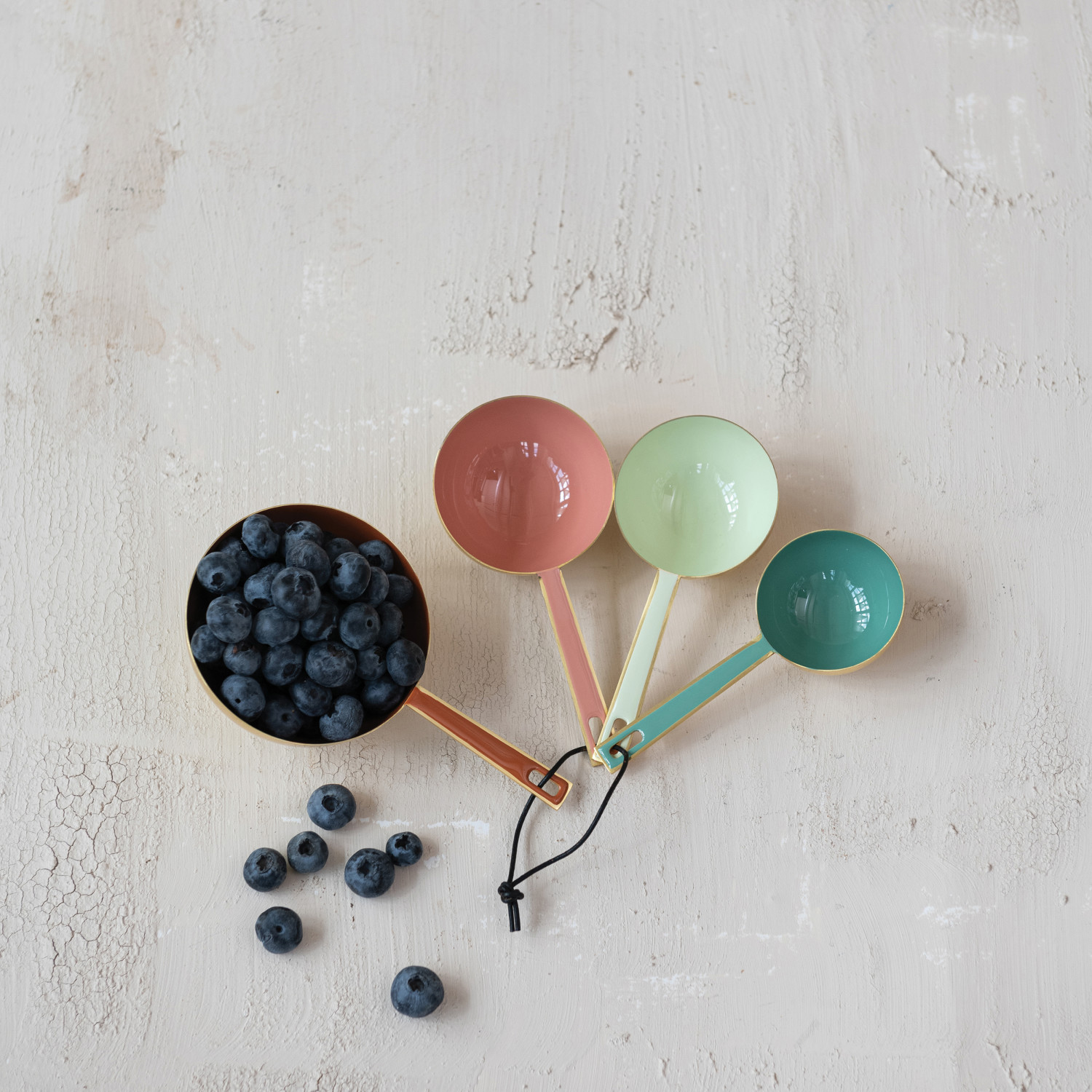 Enameled Measuring Cups with Leather Tie, 4 Colors, Set of 4