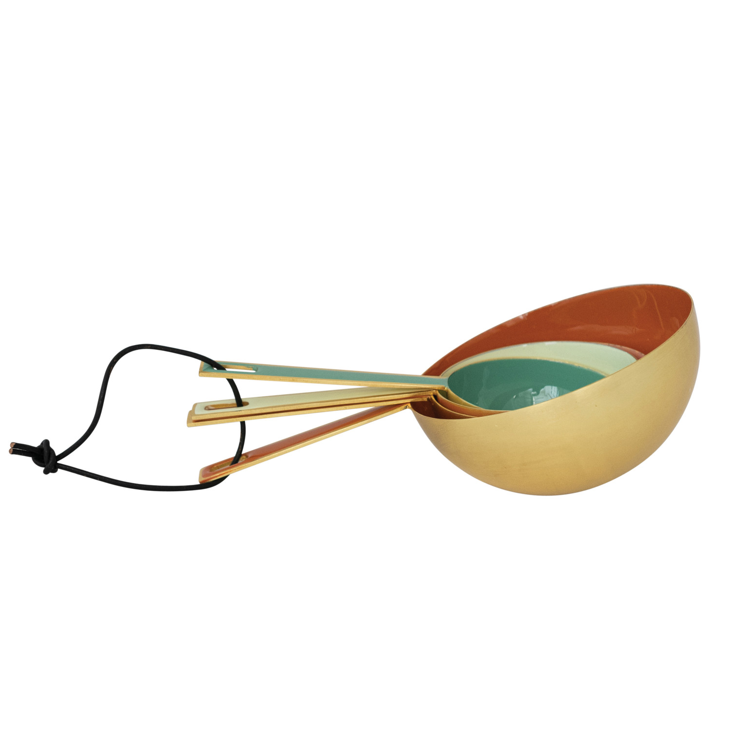 Catalog Name: 1, 1/2, 1/3 & 1/4 Cup Enameled Measuring Cups w/ Leather Tie, Gold Finish, 4 Colors, Set of 4