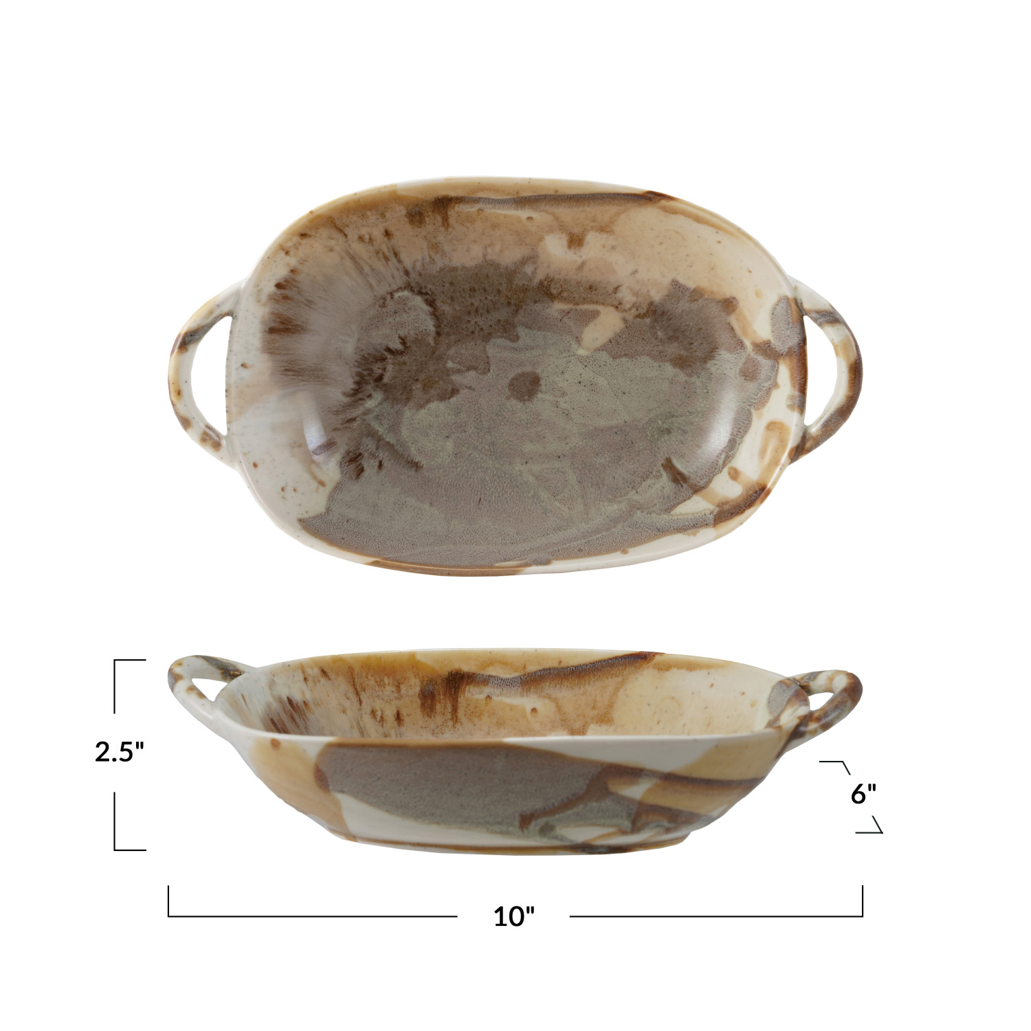 Catalog Name: 10"L x 6"W x 2-1/2"H 20 oz. Stoneware Baker/Server w/ Handles, Reactive Glaze, Multi Color (Each One Will Vary)
