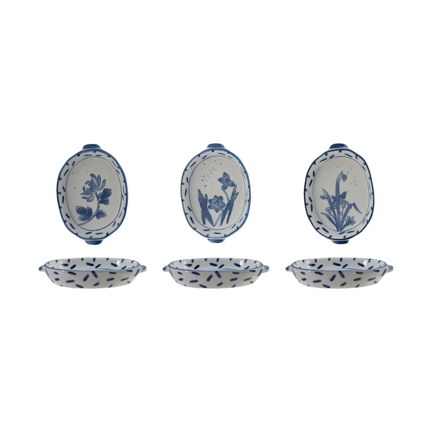 Catalog Name: 7"L x 5"W Hand-Painted Stoneware Baker w/ Handles & Floral Design, Blue & White, 3 Styles (Each One Will Vary)