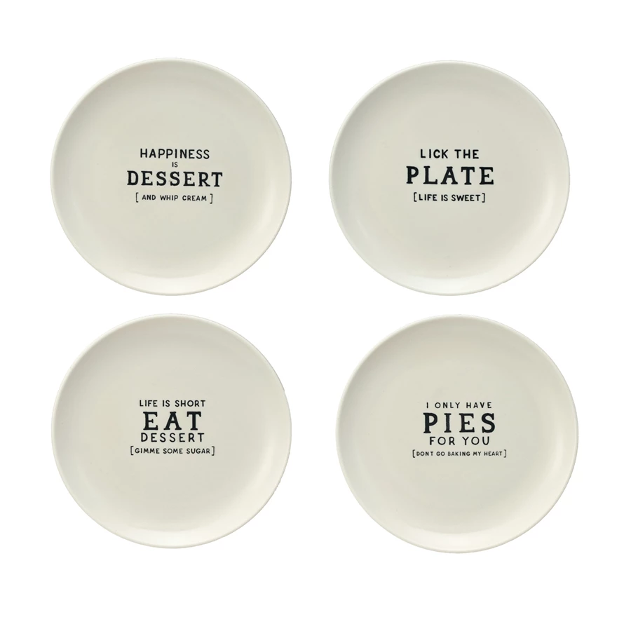 Catalog Name: 6" Round Stoneware Plate w/ Wax Relief Saying, White & Black, 4 Styles ©