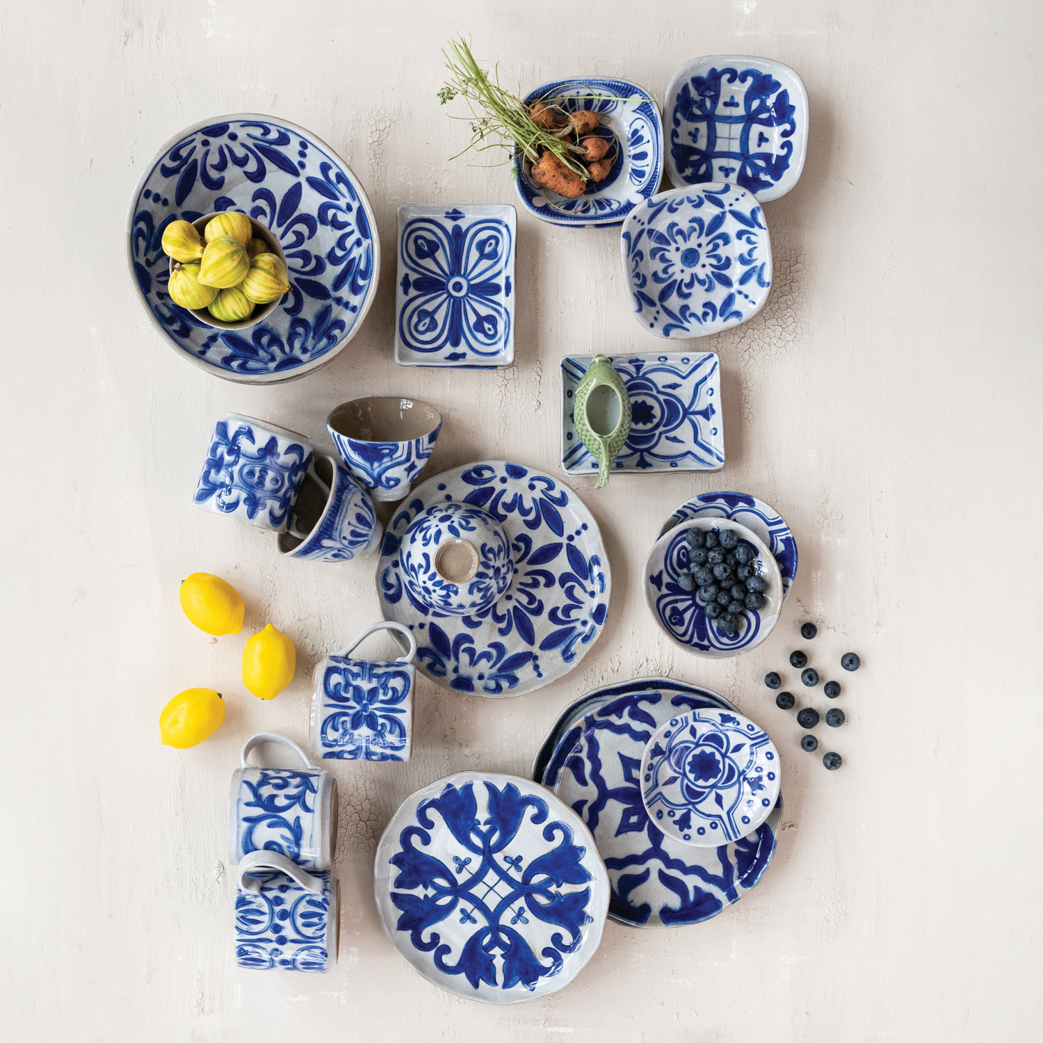 Catalog Name: 5-1/2" Square x 1-1/2"H Hand-Painted Stoneware Bowl w/ Pattern, Crackle Glaze, Blue & White, 4 Styles (Each One Will Vary)