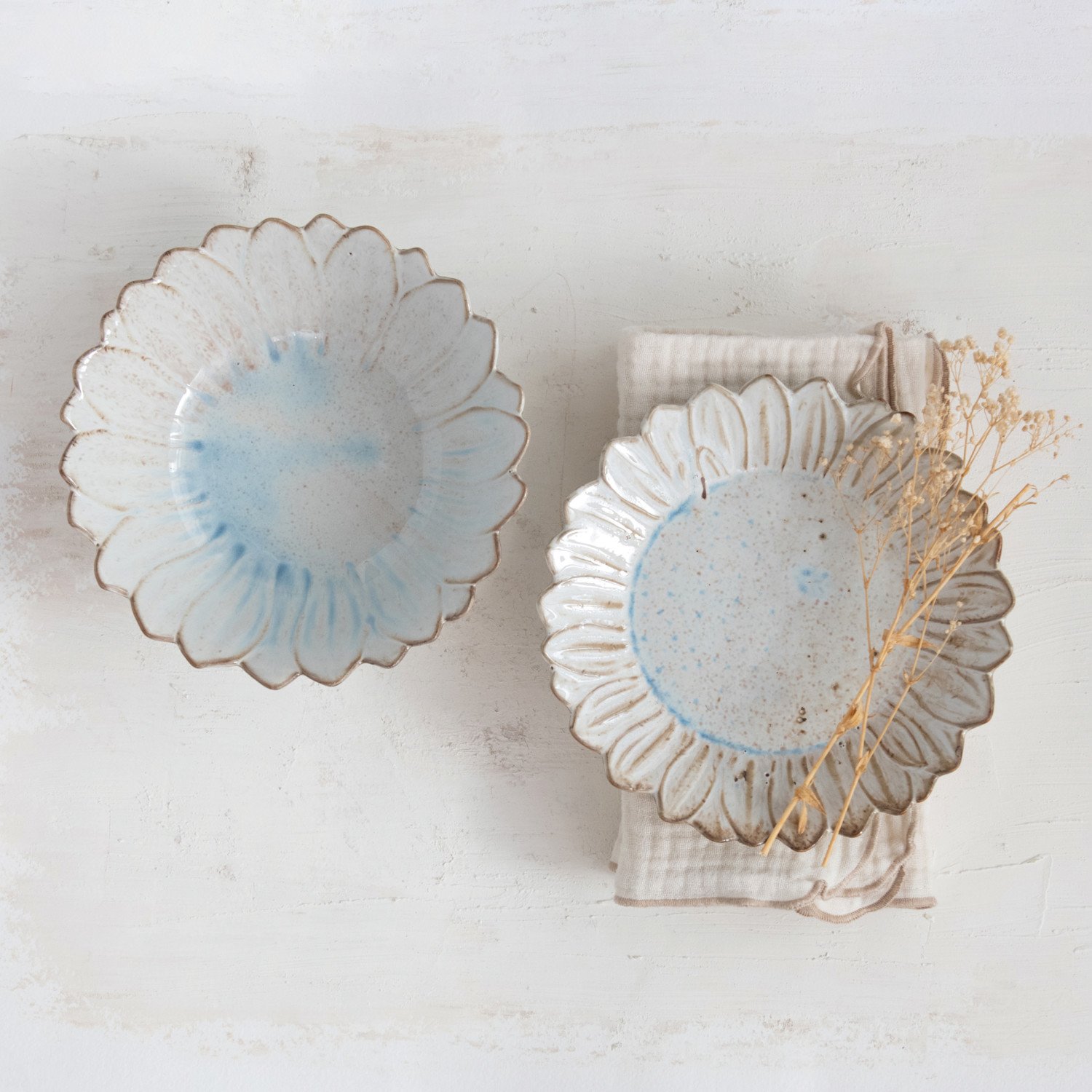 Stoneware Flower Shaped Plate, Reactive Glaze, White & Blue (Each One Will Vary)