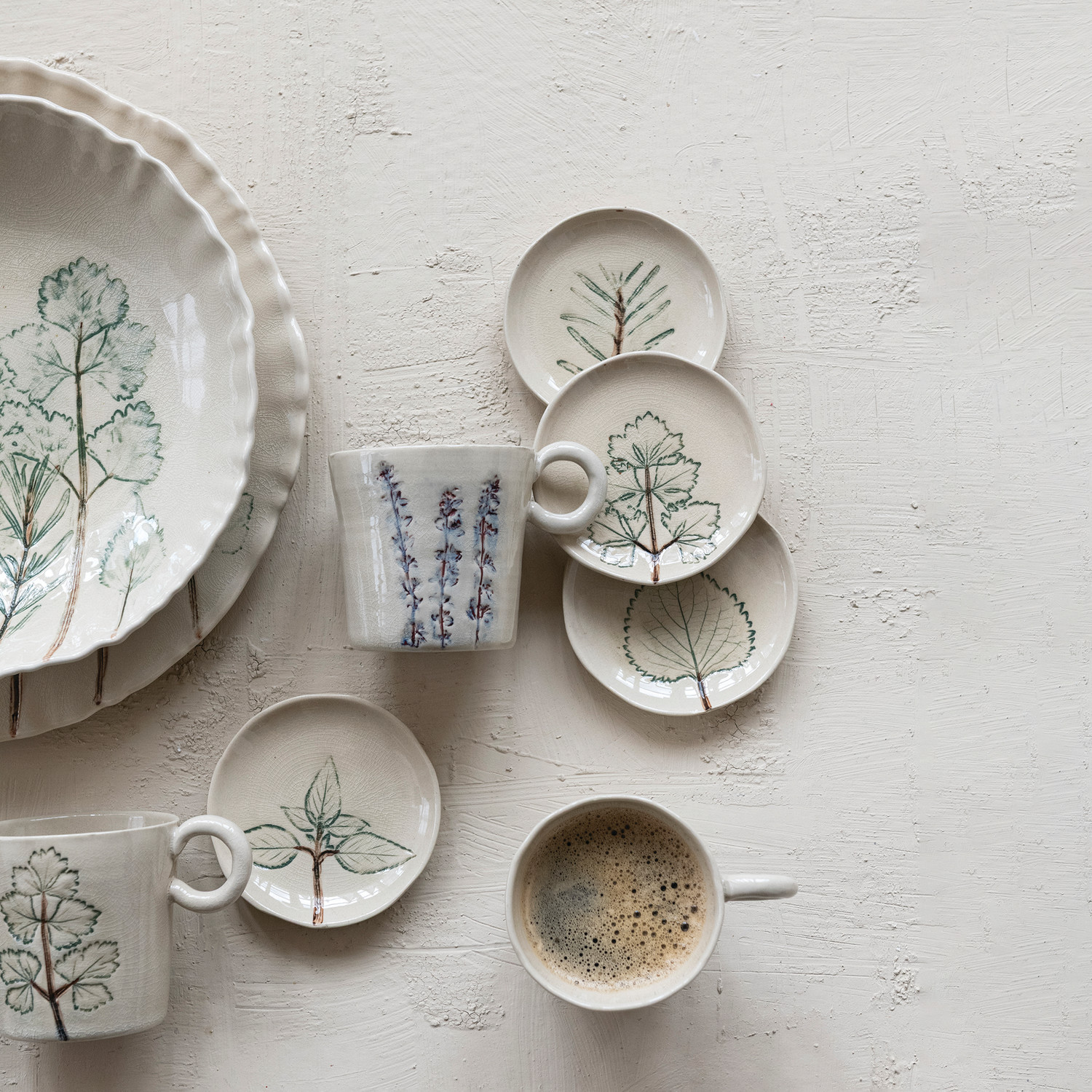 Catalog Name: 10" Round Hand-Painted Stoneware Organic Shaped Low Bowl w/ Botanicals, Crackle Glaze, Cream Color, Green & Brown (Each One Will Vary)