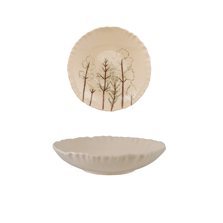 Hand-Painted Stoneware Organic Shaped Low Bowl with Botanicals (Each One Will Vary)