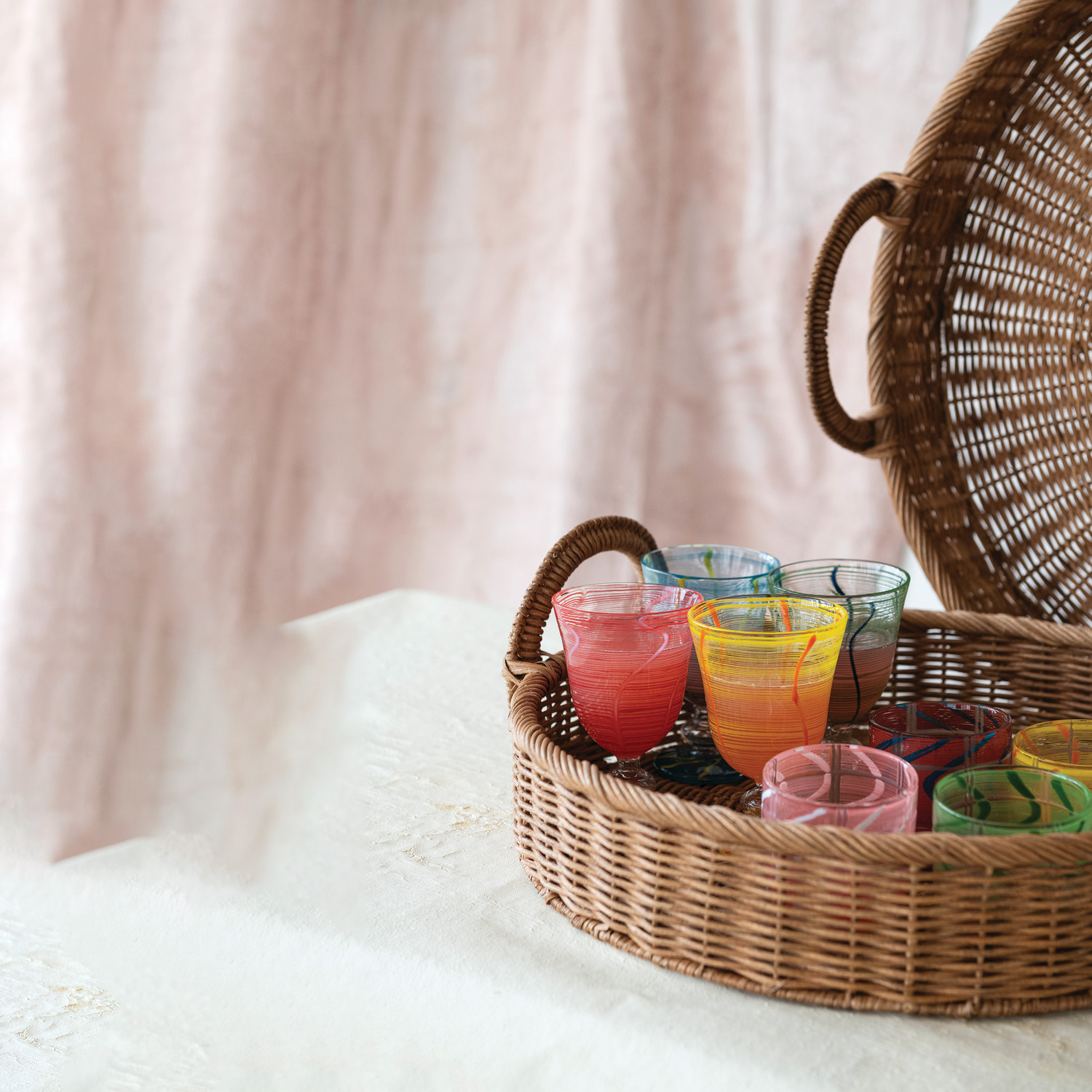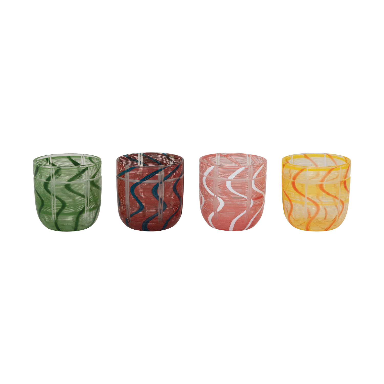 Catalog Name: 3-1/2" Round x 3"H 8 oz. Drinking Glass w/ Stripes & Wave Design, 4 Colors (Each One Will Vary)