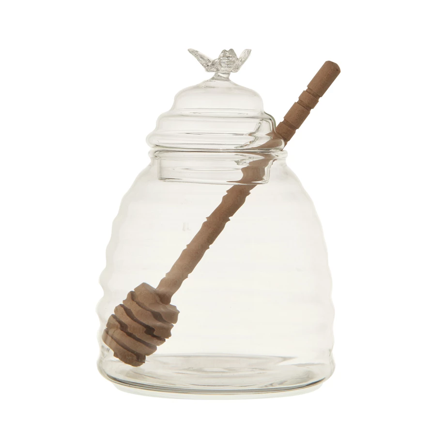 Honey should be served in this clear honey pot. The delicious honey can be seen inside, with a bamboo dipper that fits through an opening in the lid, and allows it to stay inside when the lid is closed.