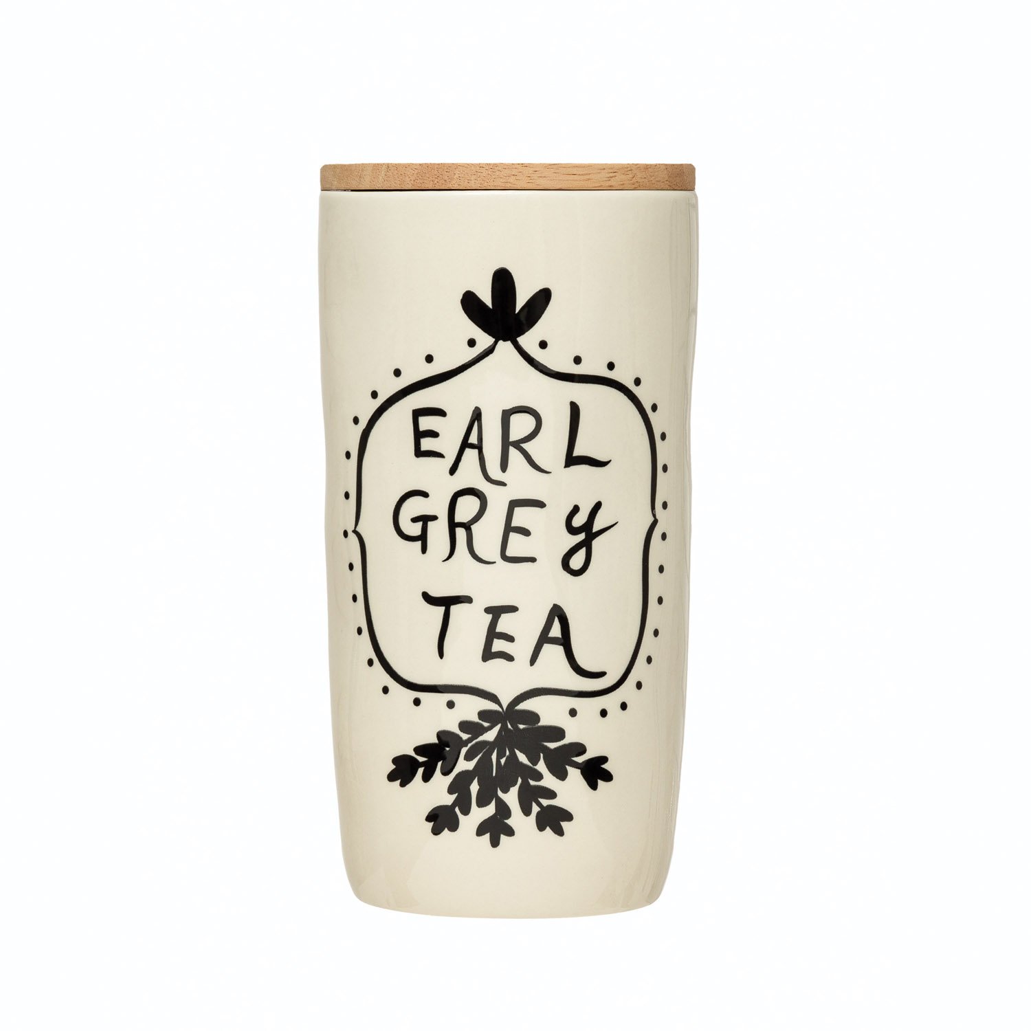 Catalog Name: 4-1/4" Round x 8-1/2"H Stoneware Jar w/ Bamboo Lid "Earl Grey Tea", White & Black