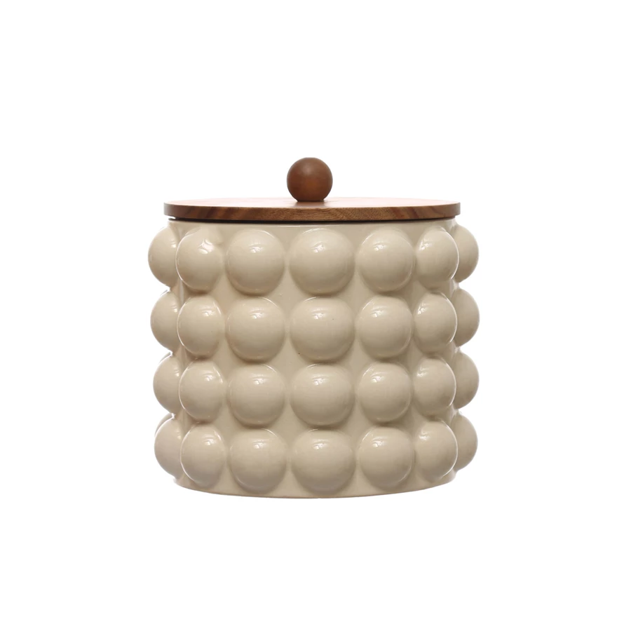 Stoneware Canister w/ Raised Dots & Acacia Wood Lid & Natural
