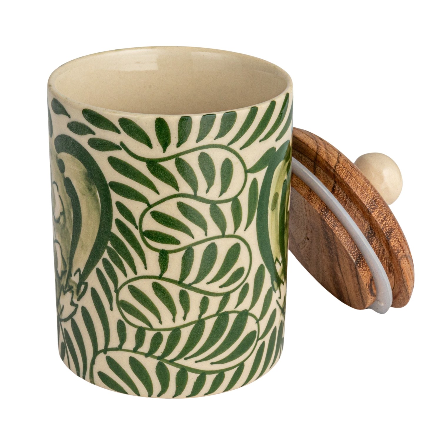 Catalog Name: 3-1/2" Round x 5"H Hand-Painted Stoneware Canister w/ Design & Acacia Wood Lid, Cream Color, Green & Natural