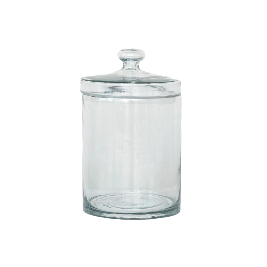 This Round Cup Glass Jar with Lid is a blend of functionality and decorative appeal. The clear glass allows for easy identification of the contents, while the embossed design adds a touch of sophistication. Whether used to store kitchen essentials or as an elegant way to display collectibles, this jar fits seamlessly into a variety of decor styles. It measures 5.25 inches in diameter and 8.75 inches in height, offering ample space for storage needs. Its round shape and size are perfect for both practical storage and aesthetic display, making it a versatile addition to any farmhouse, French country, or vintage setting. The jar's classic design ensures it will remain a cherished piece for years to come.