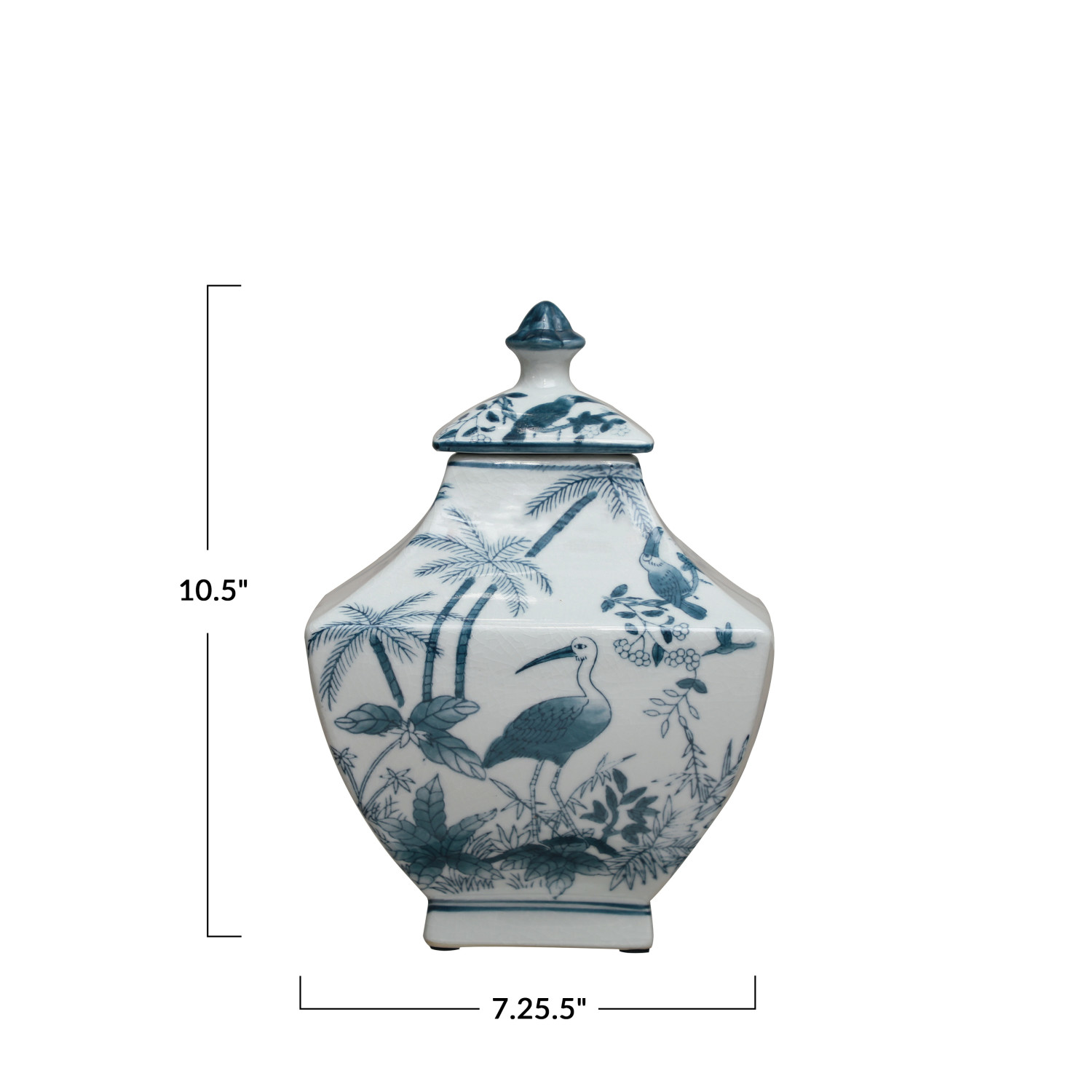 Catalog Name: 7-1/4" Square x 10-1/2"H Hand-Painted Porcelain Vintage Reproduction Ginger Jar w/ Birds, Crackle Glaze, Blue & White (Each One Will Vary)