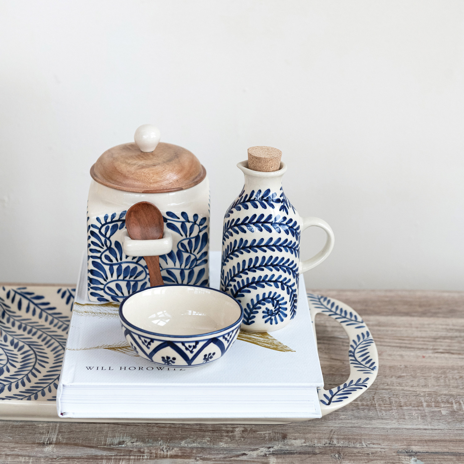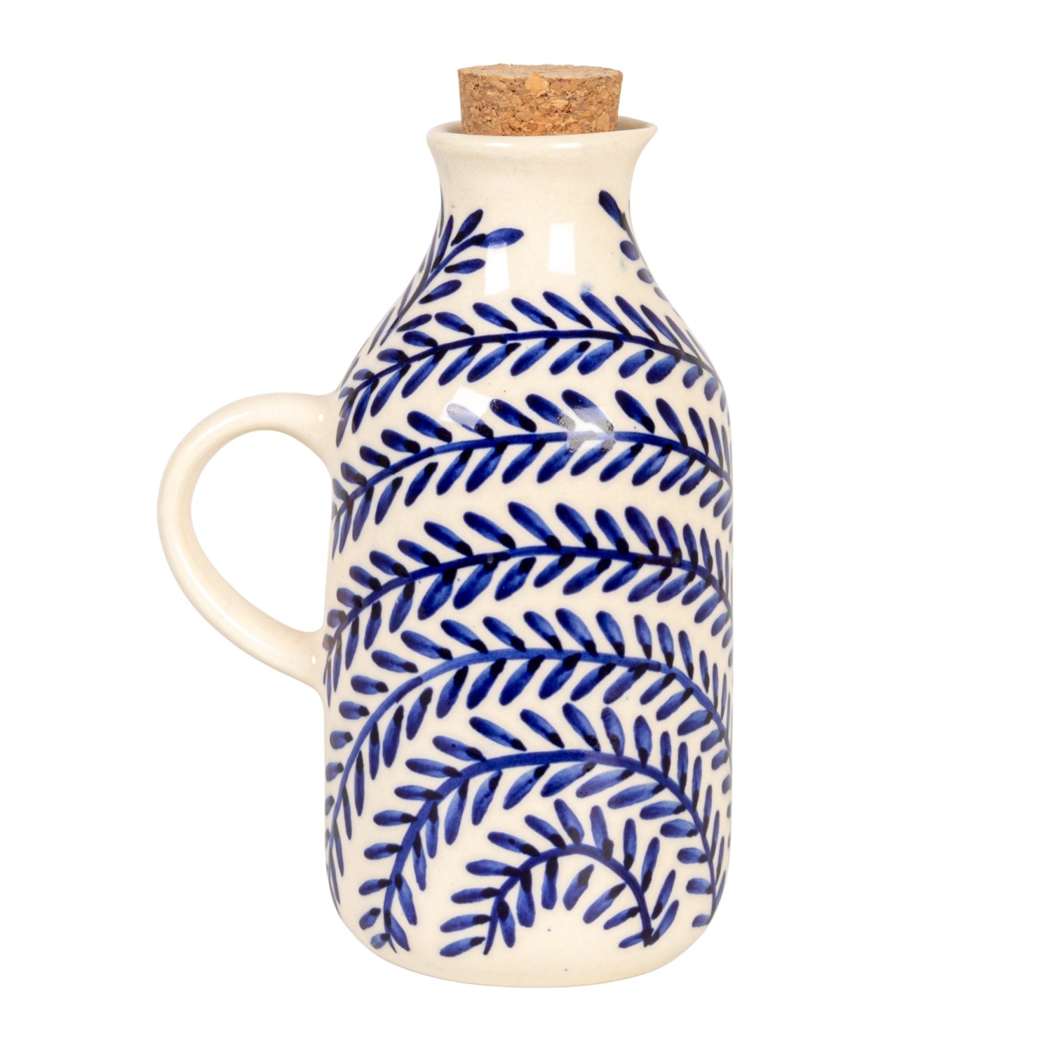 Catalog Name: 3-3/4"L x 2-3/4"W x 5-3/4"H 8 oz. Hand-Painted Stoneware Oil Cruet w/ Botanical Pattern & Cork Stopper, Cream Color & Blue