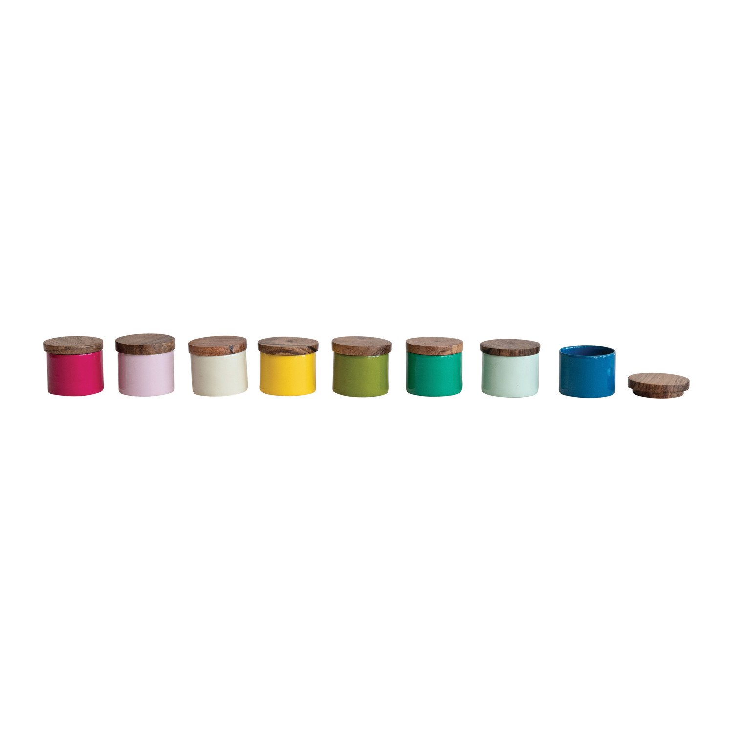 Catalog Name: 1-3/4" Round x 1-3/4"H Enameled Metal Mini Pinch Pot w/ Acacia Wood Lid, 8 Colors