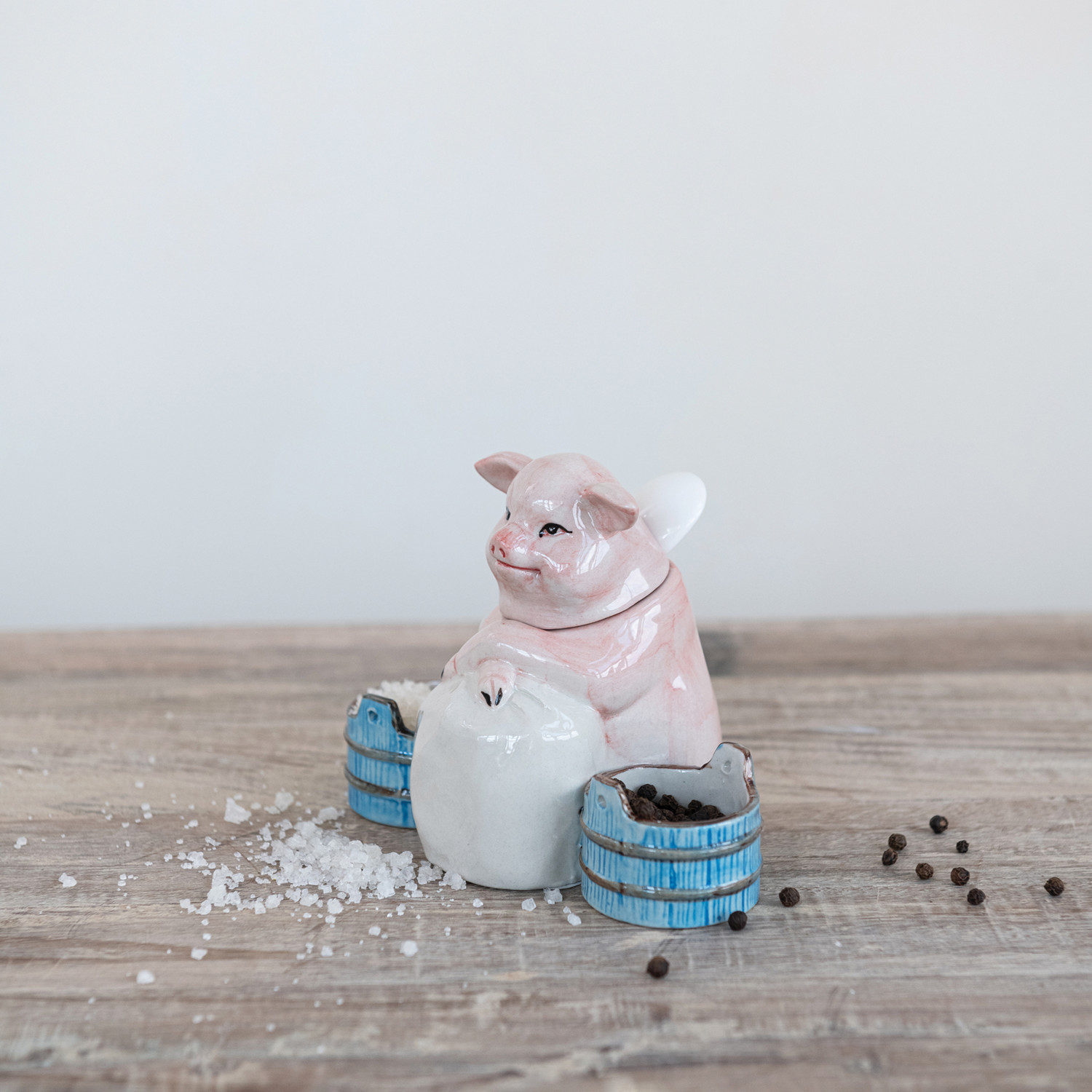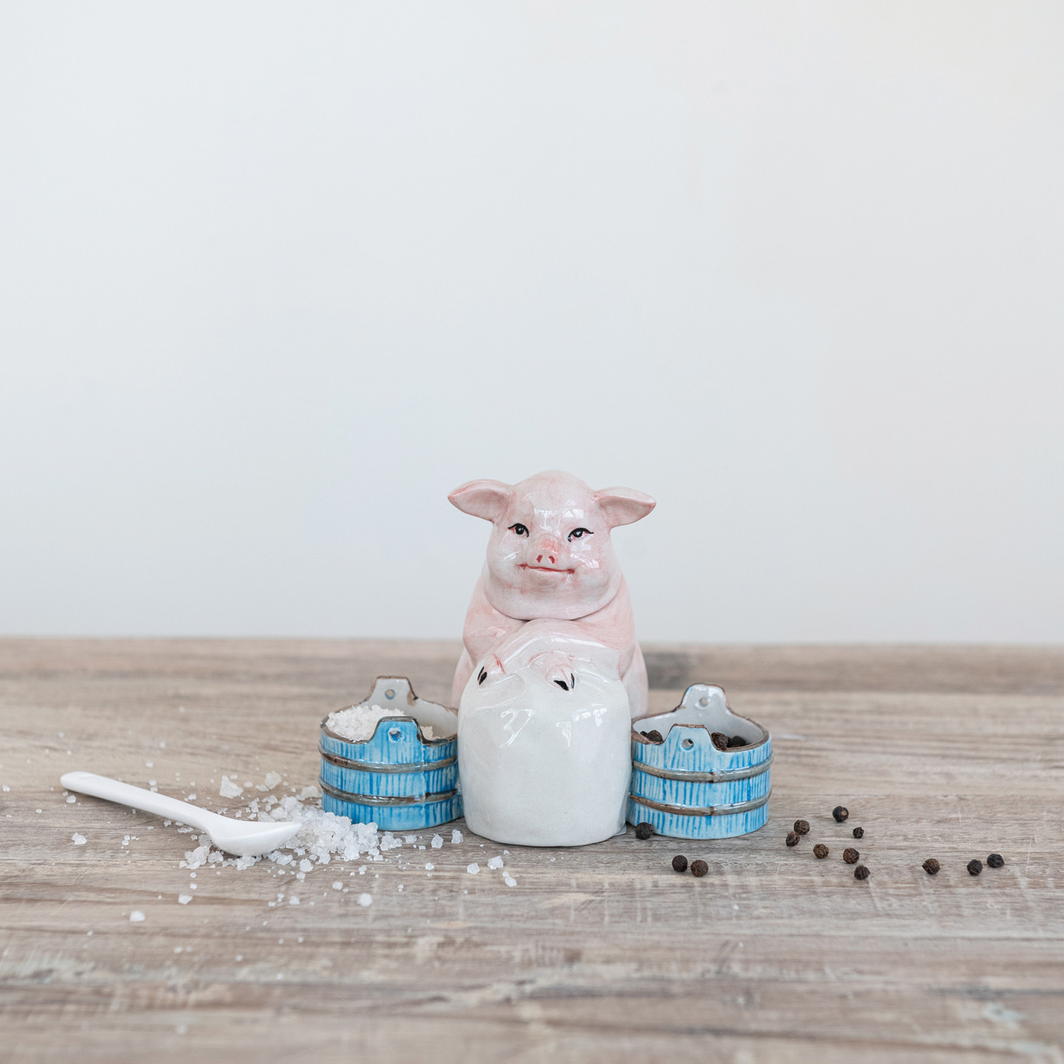 Catalog Name: 4-1/2"L x 3-1/4"W x 3-3/4"H Stoneware Vintage Reproduction Pig Shaped Mustard Pot w/ 3 Sections & Spoon, Multi Color, Set of 2