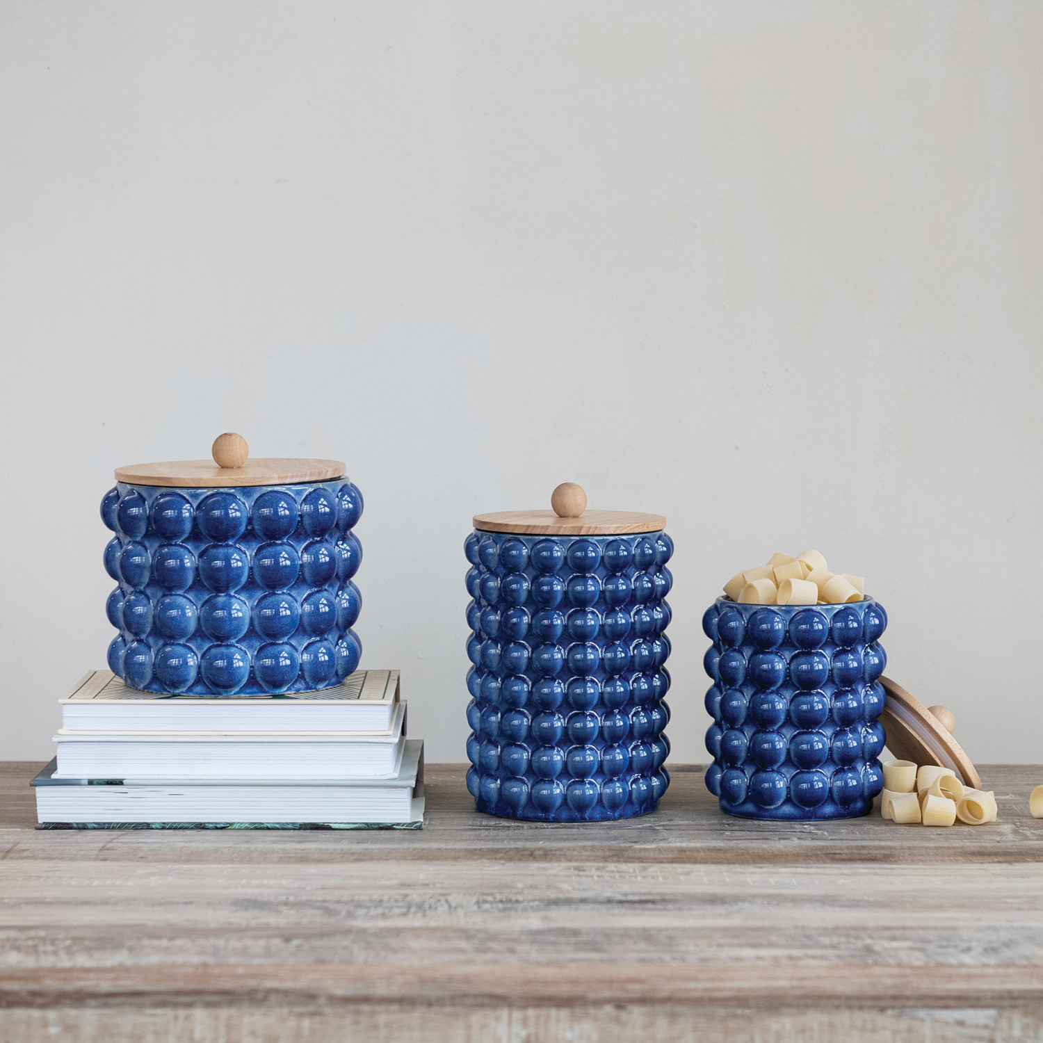 Stoneware Canister with Raised Dots & Wood Lid (Each Will Vary)