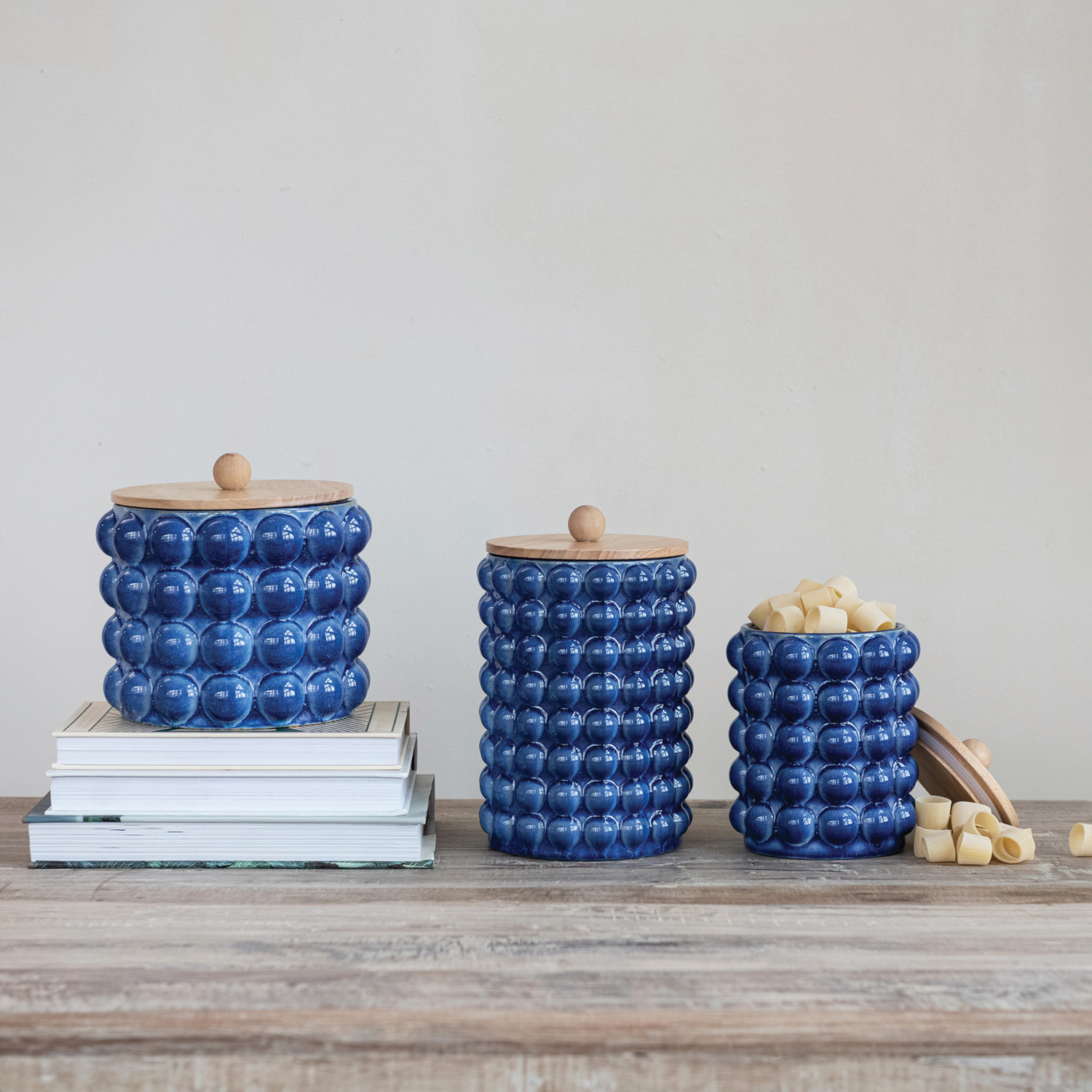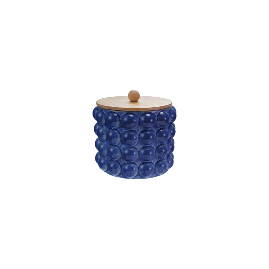 Stoneware Canister with Raised Dots & Wood Lid (Each Will Vary)