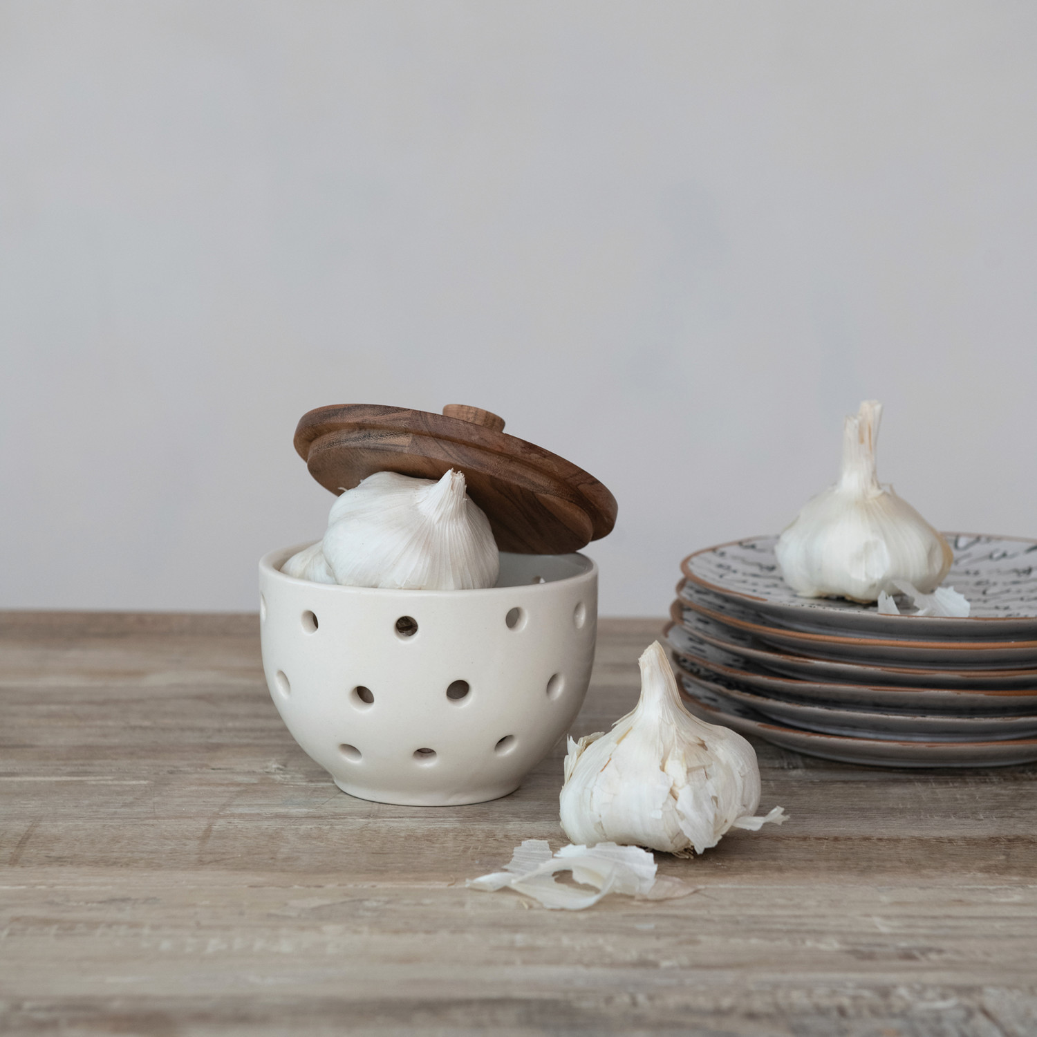 Stoneware Garlic/Onion Keeper w/ Mango Wood Lid, Cream Color & Natural