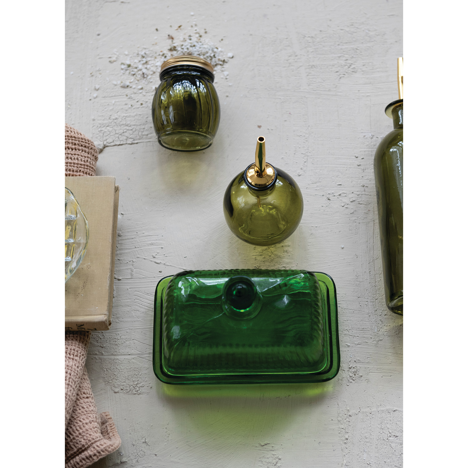 Catalog Name: 6-1/2"L x 4"W x 4-3/4"H Pressed Ribbed Glass Butter Dish, Green