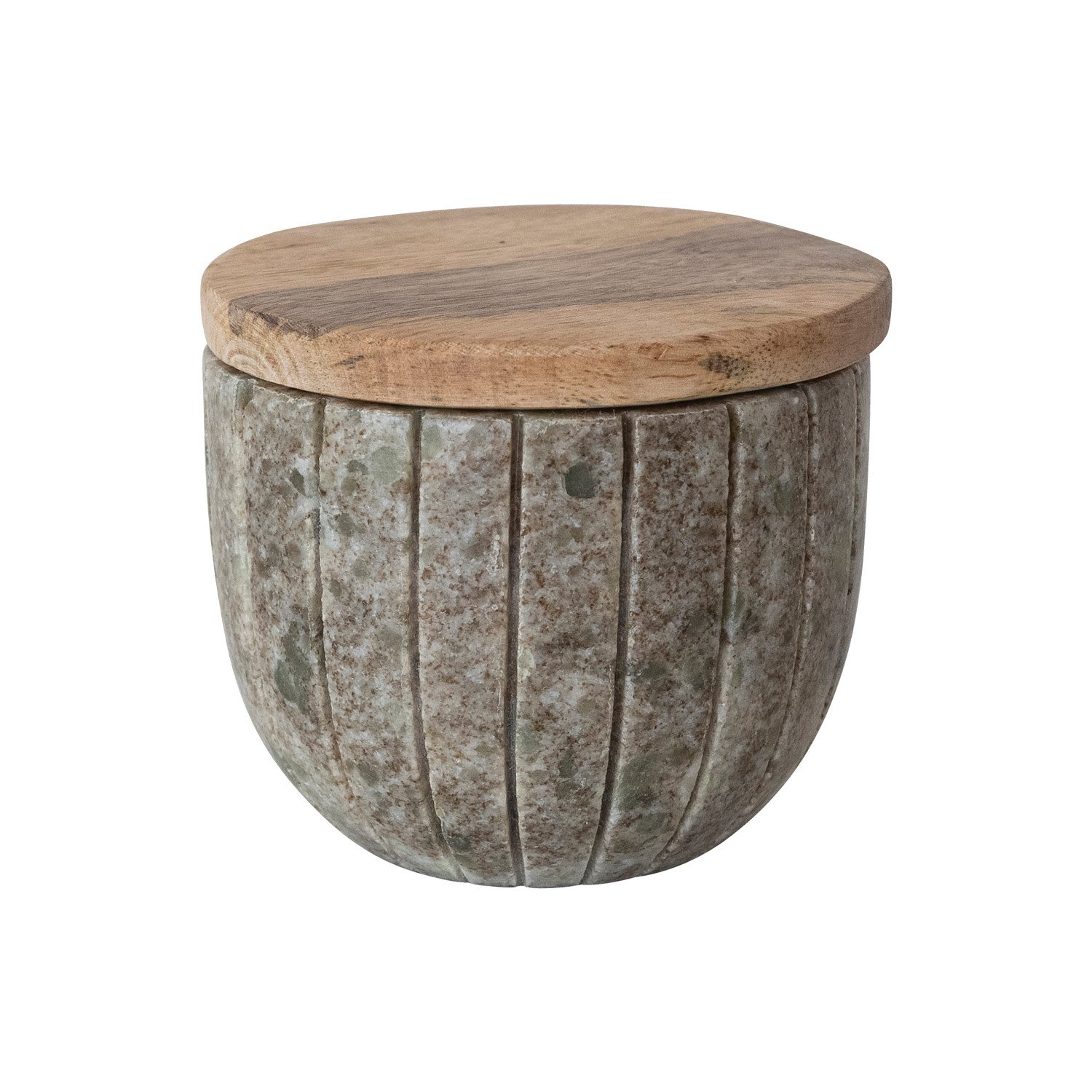 Carved Marble Container with Mango Wood Lid, Brown & Natural