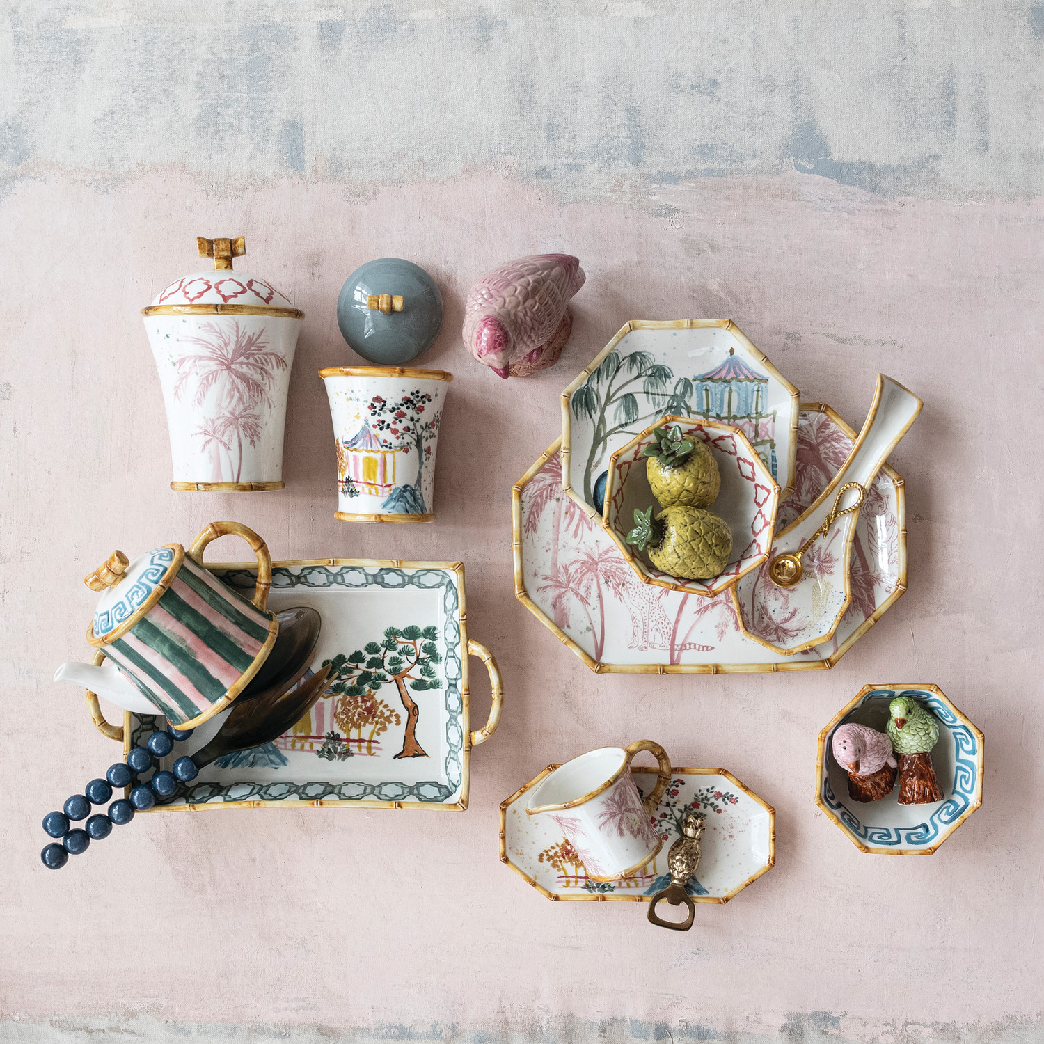 Hand-Painted Stoneware Canister with House, Palm Tree & Bamboo Style Edges