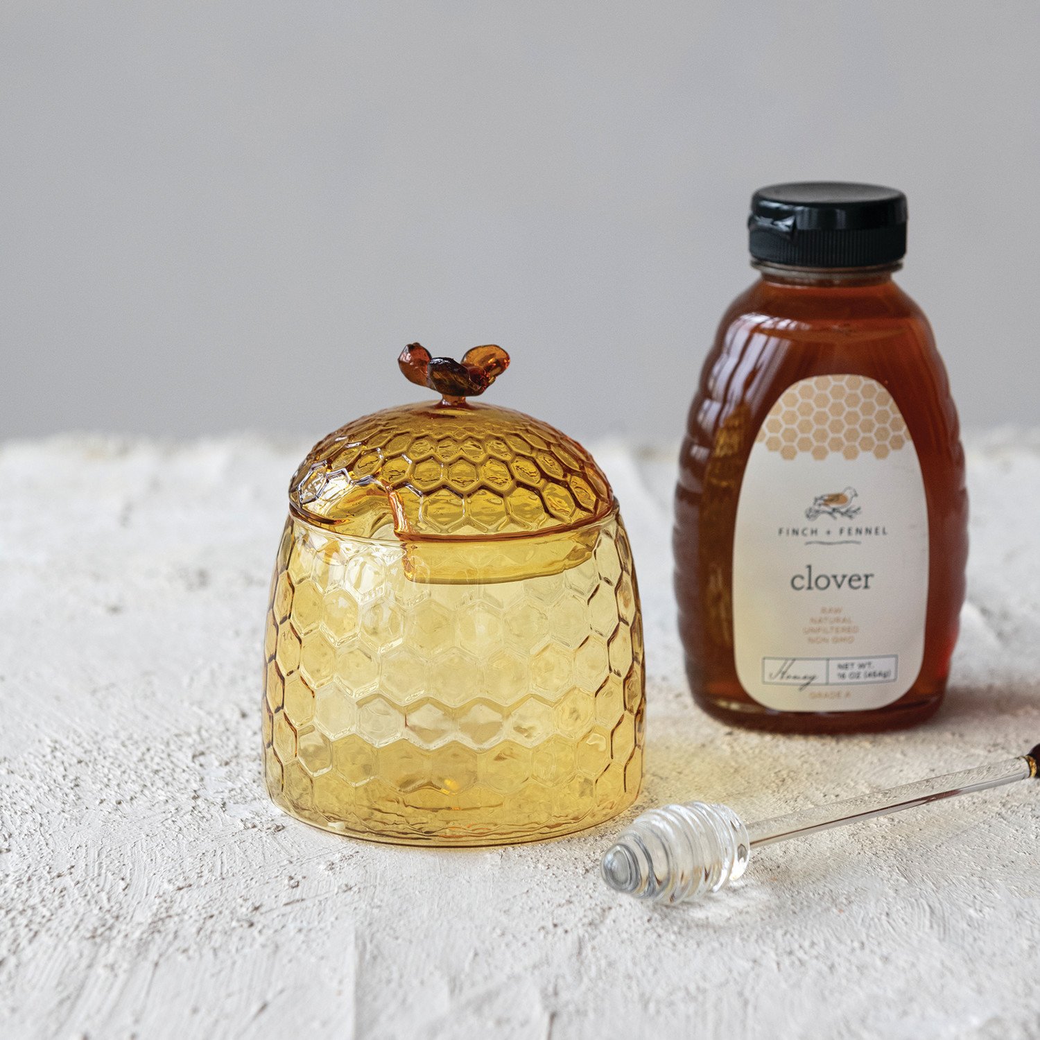 Glass Honey Jar with Bee Finial, Honey Dipper & Lid, Yellow & Amber Color, Set of 2