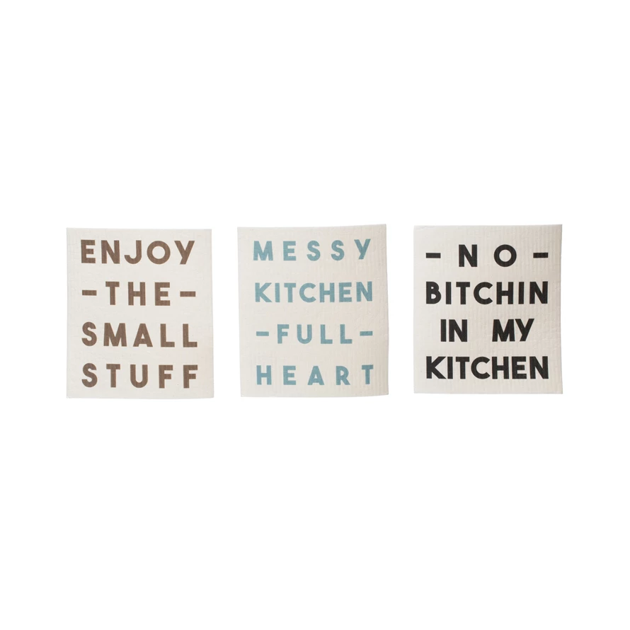 Catalog Name: 7-1/2"L x 6-3/4"W Reusable Cellulose Sponge Cloth w/ Saying, Multi Color, 3 Styles