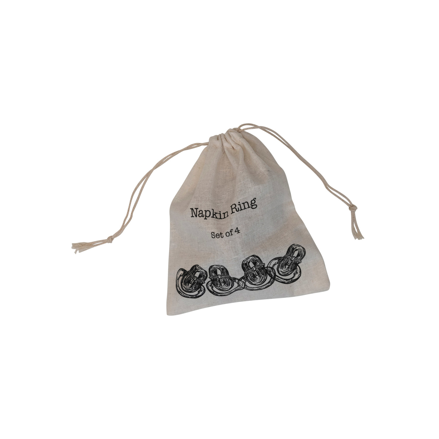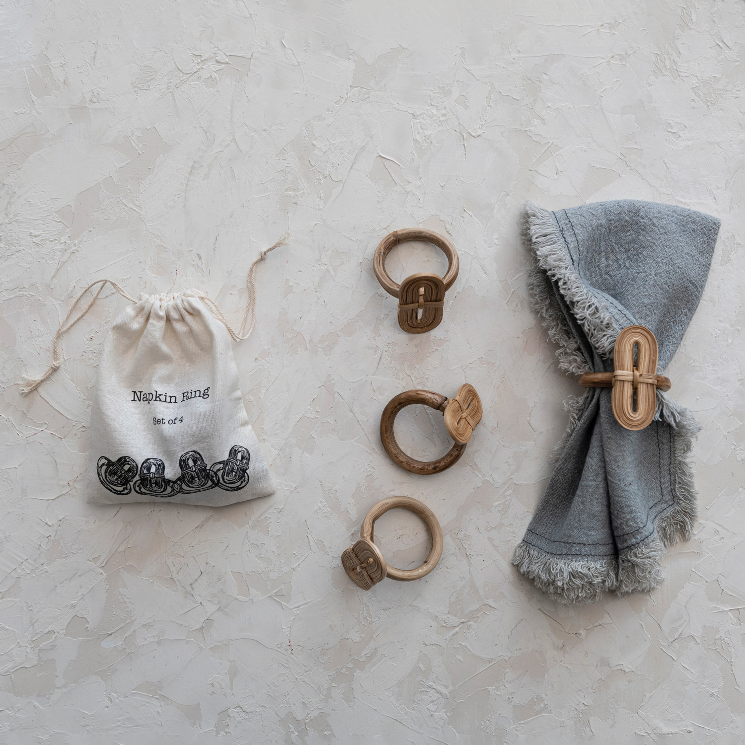 Featuring a vast selection of lush woven textures, intricate details, and timeless patterns, our collection of entertaining textiles and accessories will bring warmth and elegance to a dining space of any style. Instantly transform a breakfast nook or dining room into a sophisticated sanctuary by exploring a vast array of textiles and accessories fit for any space including table runners, napkin sets, placemats, napkin rings, tea towels, dish cloths, sponge cloths, pot holders, food pouches, aprons, and so much more. Choose from a wide variety of luxurious fabrics from cotton and velvet to linen and seagrass, and styles from mid-century modern and boho to classic farmhouse and contemporary. This naturally crafted set of napkin rings features woven bamboo construction and a decorative drawstring bag. Linen drawstring bag with "Napkin Ring, Set of 4" printed with illustration of rings. Not dishwasher safe. Made from bamboo.