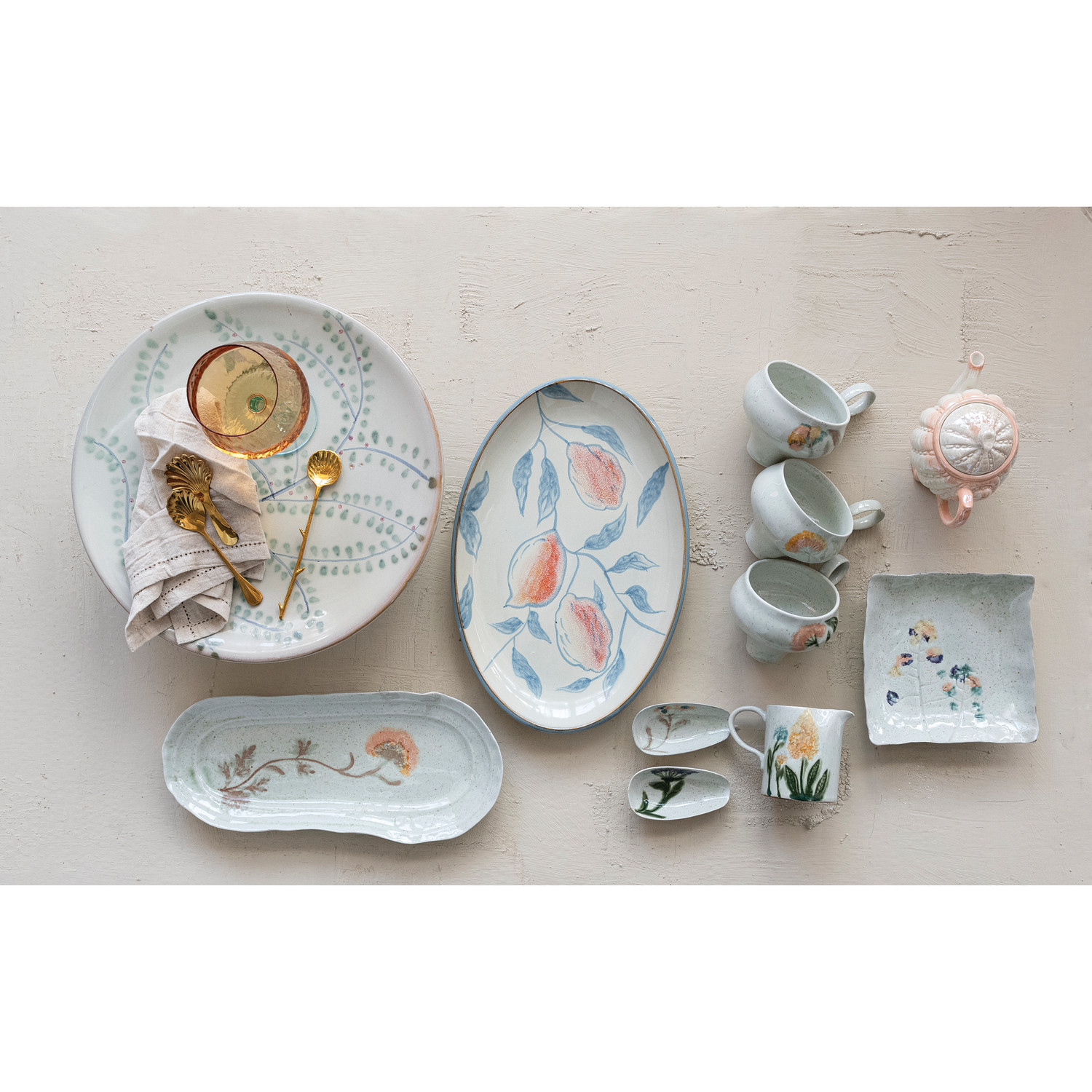 Hand-Painted Stoneware Dish with Flowers, 2 Styles (Each One Will Vary)