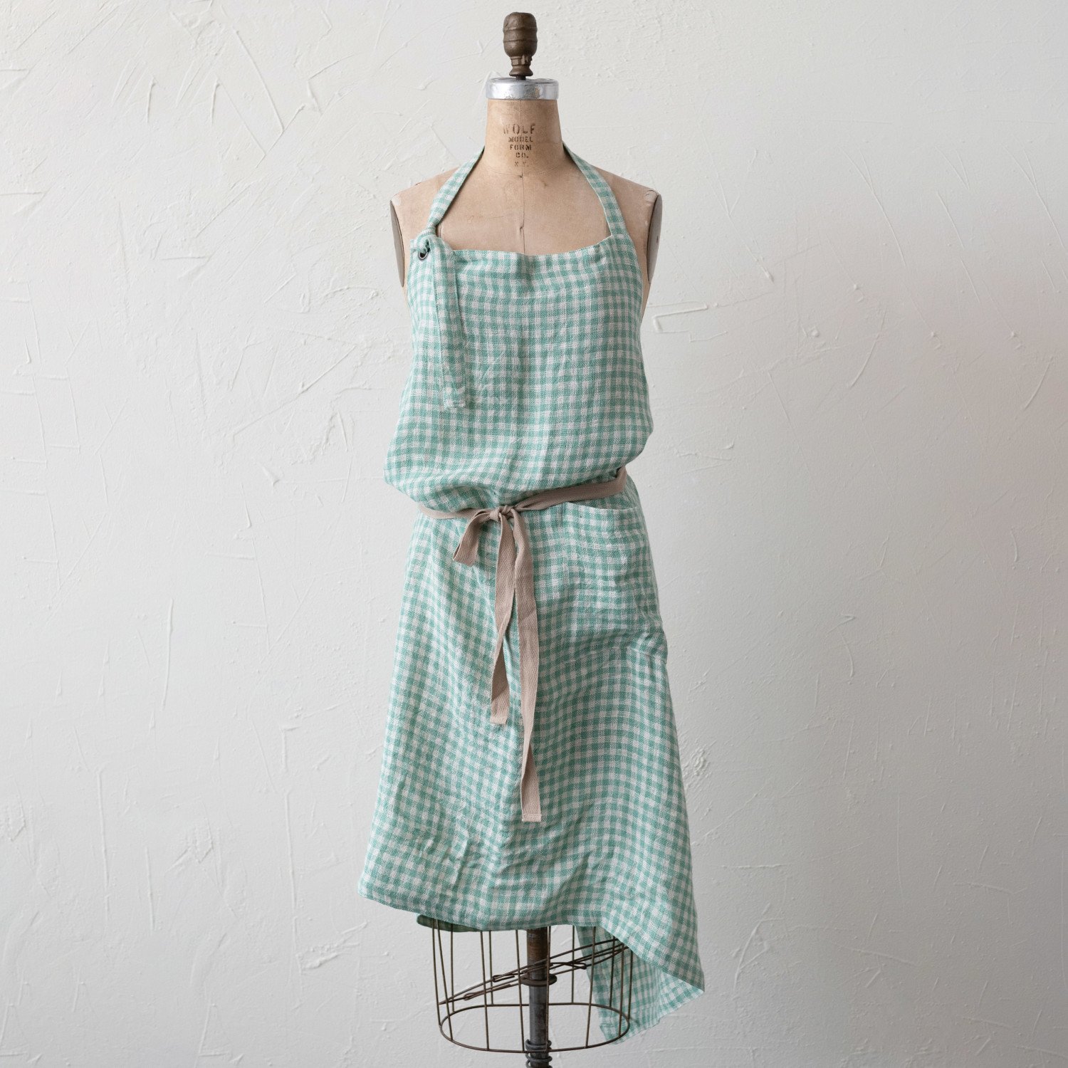This classically designed woven linen and cotton apron features a gingham print and functional pocket. Machine Wash Warm In Mesh Bag, Gentle Cycle, Do Not Bleach, Tumble Dry Low, Warm Iron if Needed.